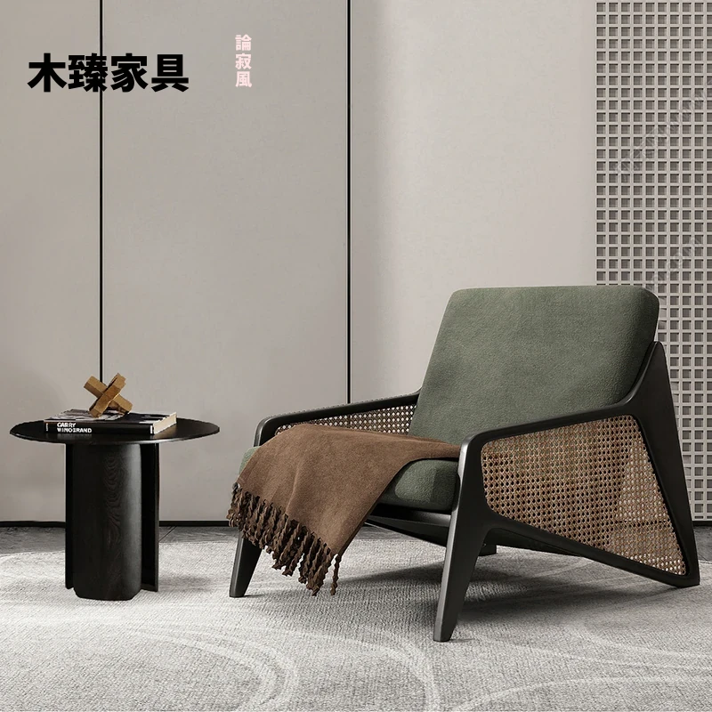 新中式スタイルの無垢材ソファチェア3点セット - 侘寂風のラタン編みリラックスチェア、ホテルやサロンに最適なナチュラルな一人掛け椅子。優雅で温かみのあるデザインで、心地よいひとときを提供します。