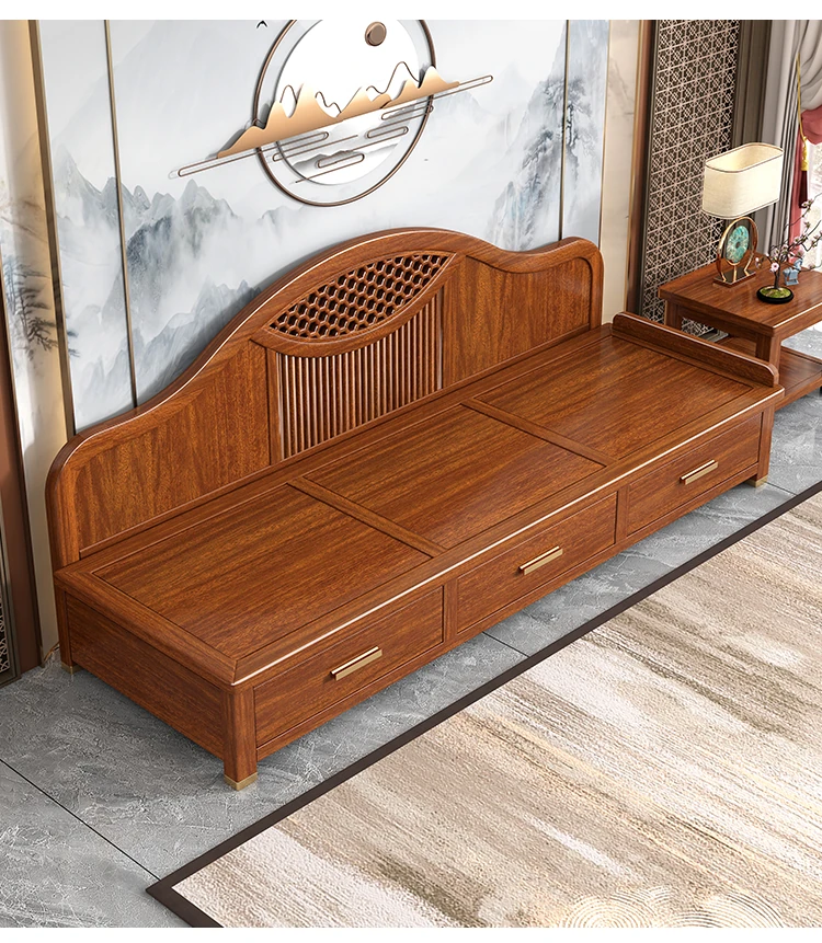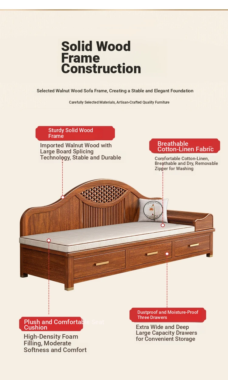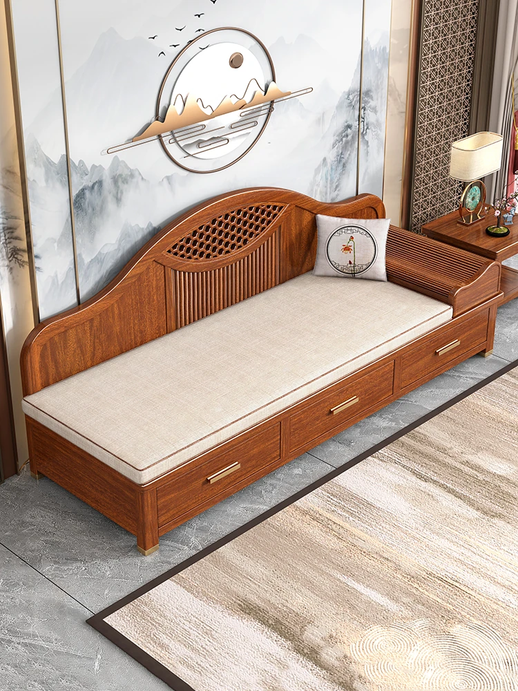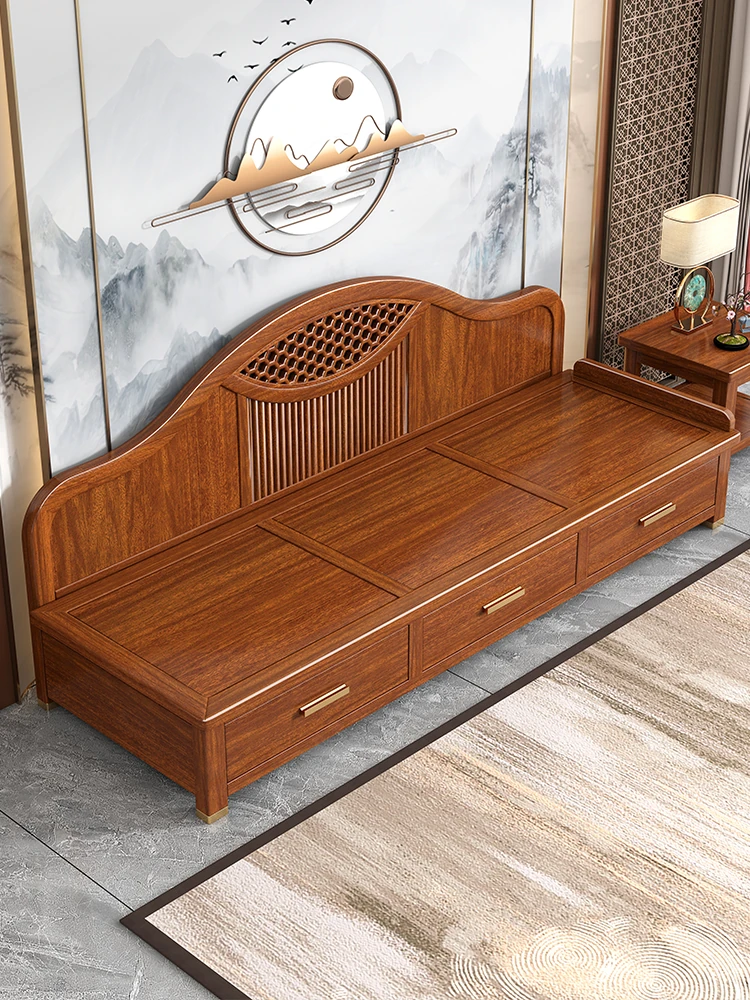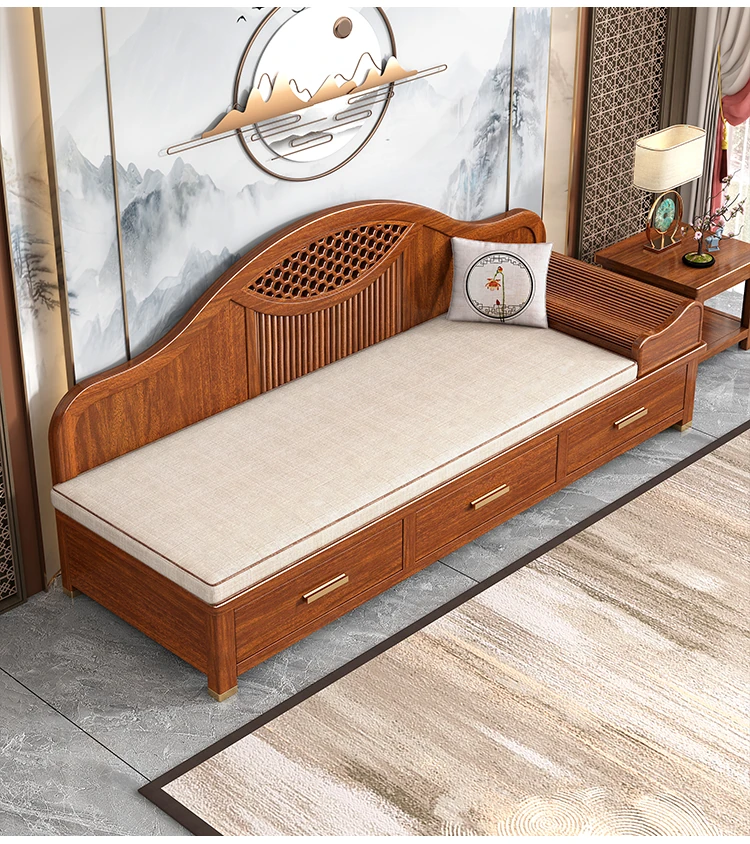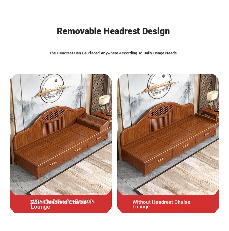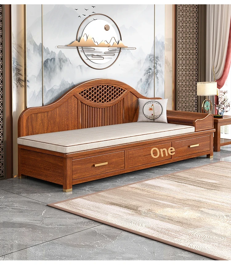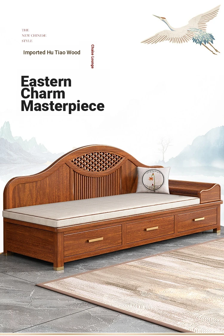 Elegant Solid Wood Chaise Lounge - Walnut Finish, Stylish Living Room Sofa Bed with Storage, Modern Chinese Design, Perfect for Bedroom Relaxation and Comfort