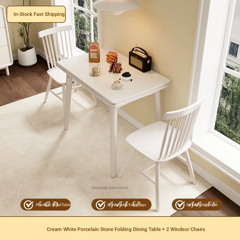 Cream White Rock Board Foldable Dining Table +2 Windsor Chairs