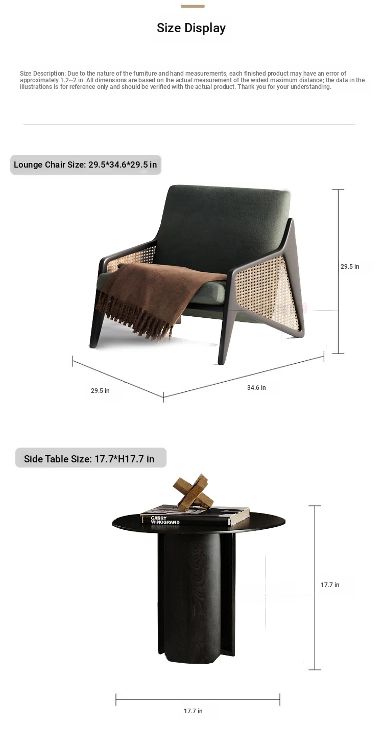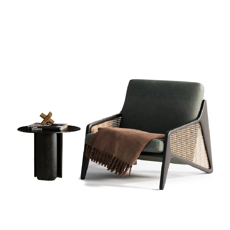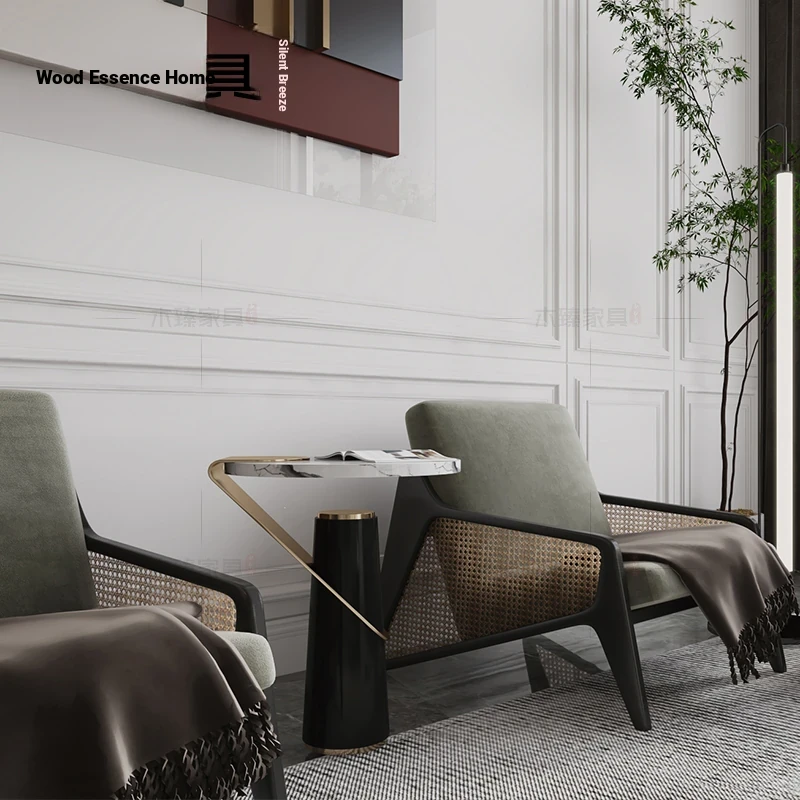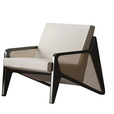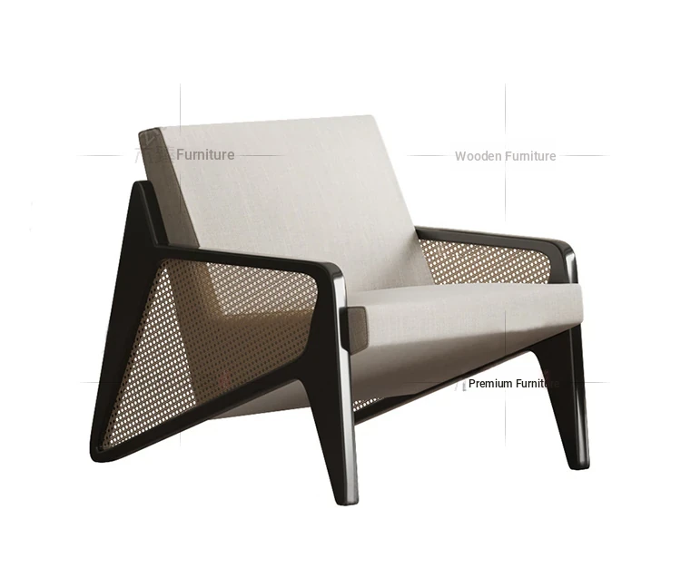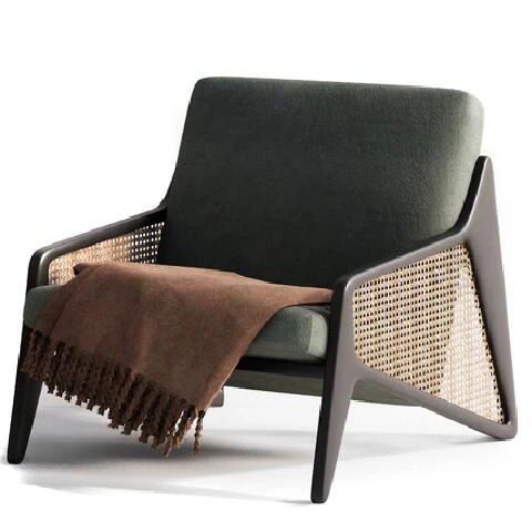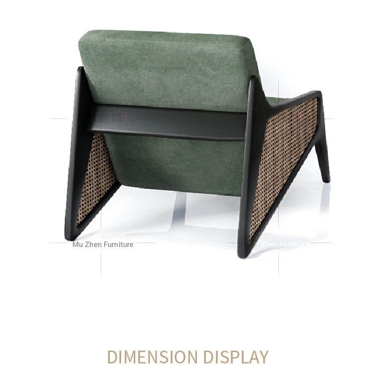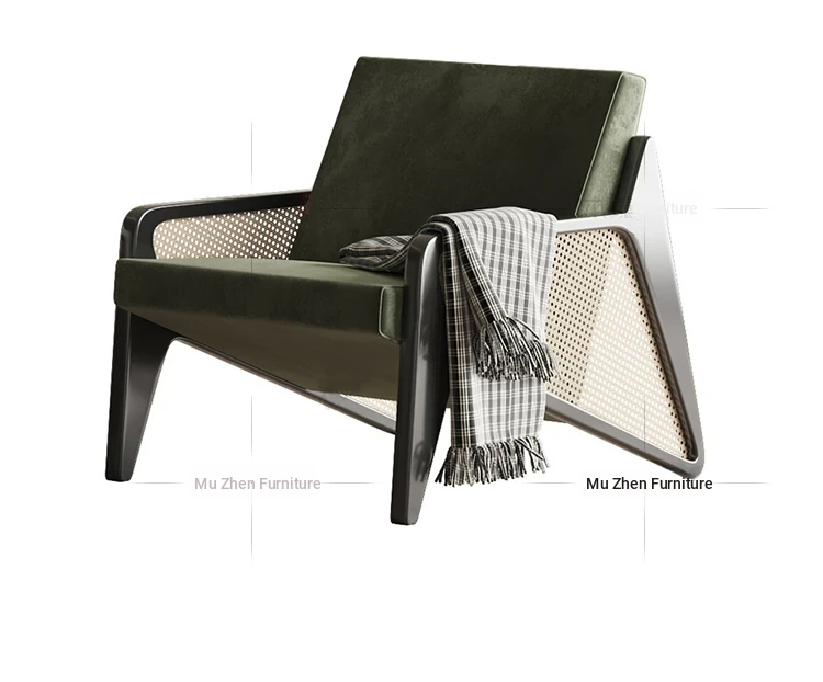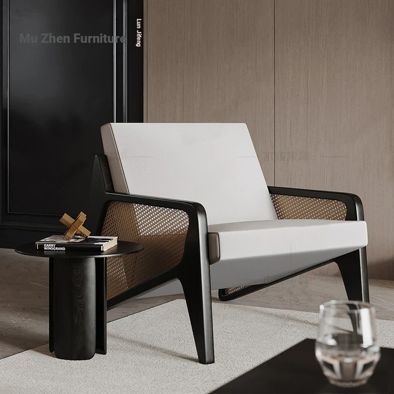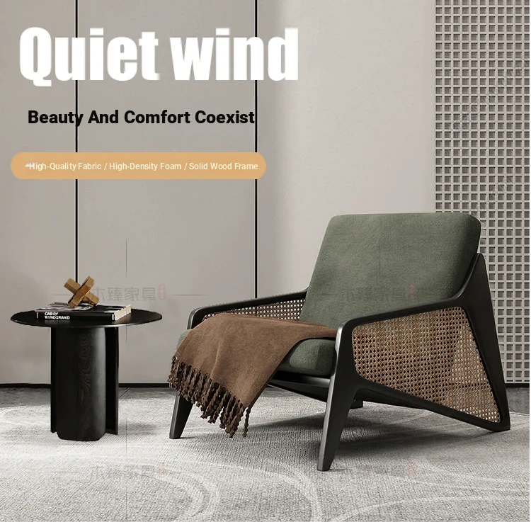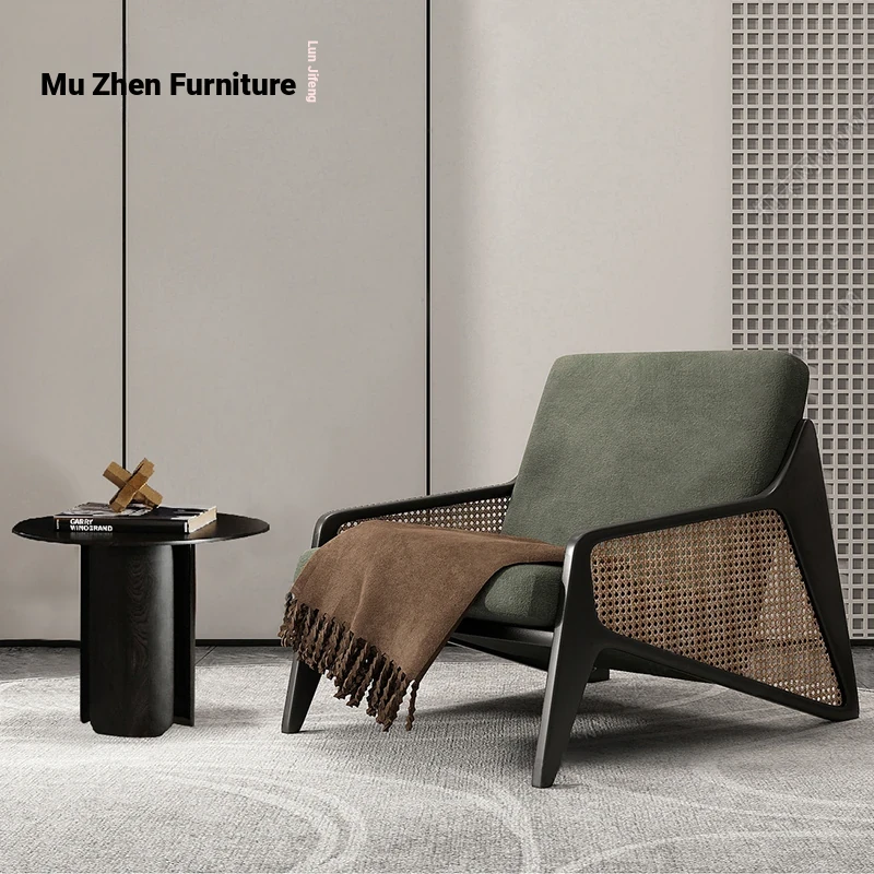 Japanese Wabi-Sabi Style Rattan Upholstered Lounge Chair – Designer Solid Wood Single Sofa for Living Room, Balcony, Bedroom, and Hotel Use. Perfect Blend of Comfort and Aesthetic Elegance!