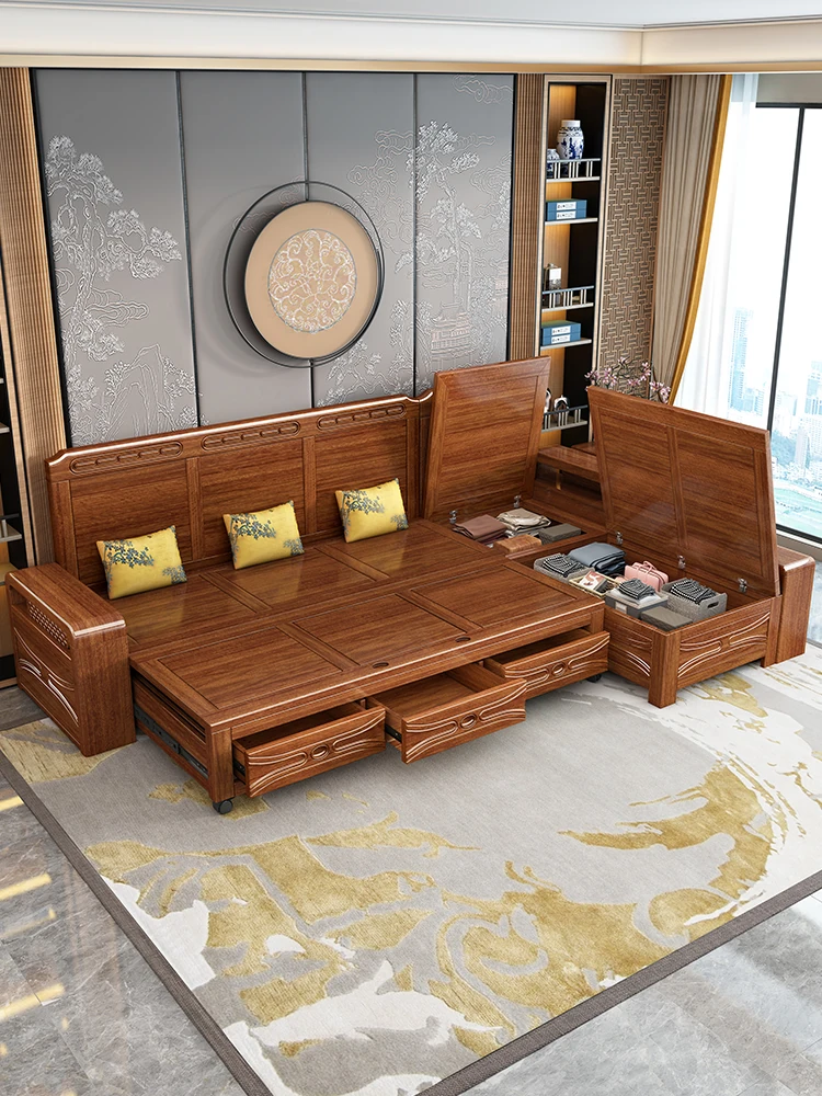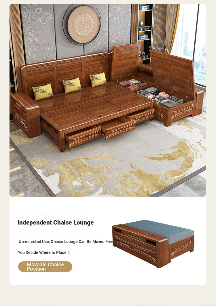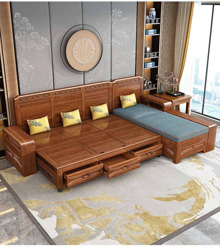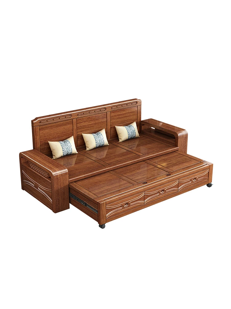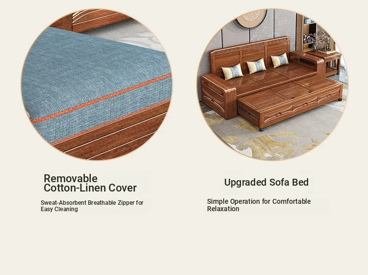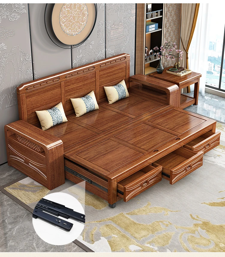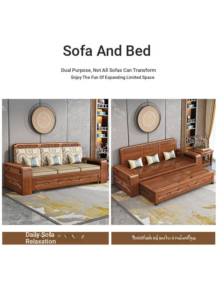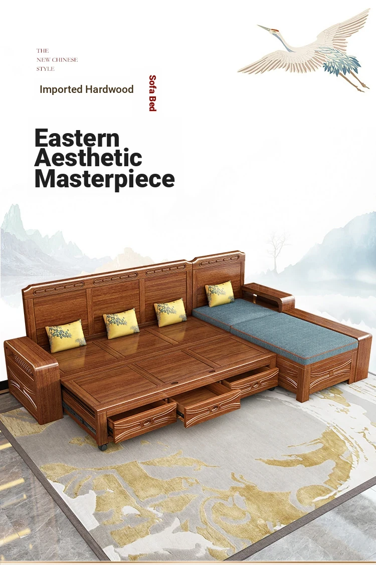 Luxury Foldable Sofa Bed in Golden Walnut Wood - Multi-functional Space-Saving Solution for Small Living Rooms - Stylish New Chinese Design with Ample Storage