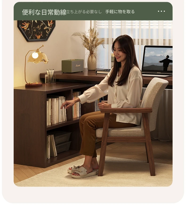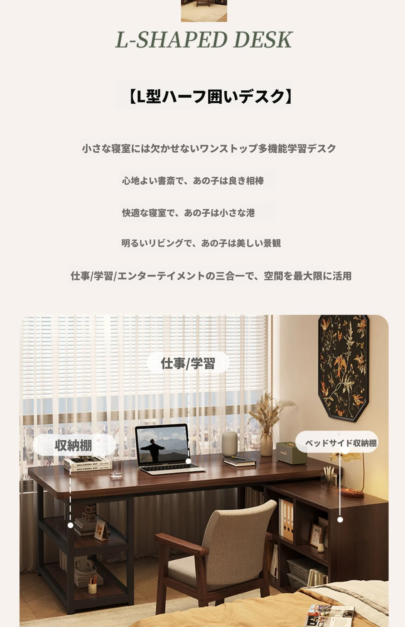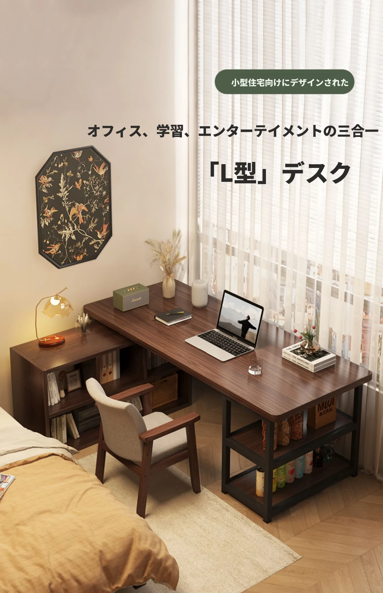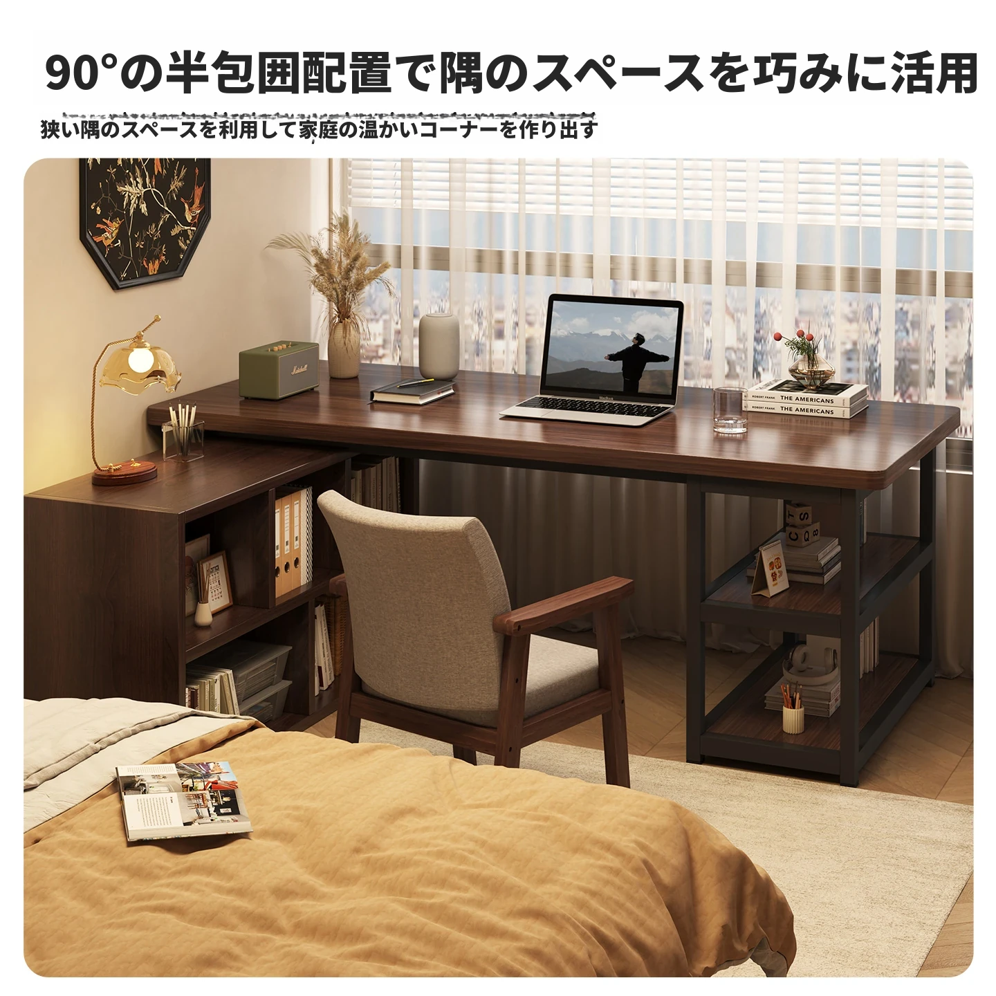 窓辺にぴったり!コーナーデスク&書棚一体型ワークステーション - スタイリッシュな収納付き、書きやすさ抜群のリビングや寝室に最適なデスク。快適な作業空間を実現!