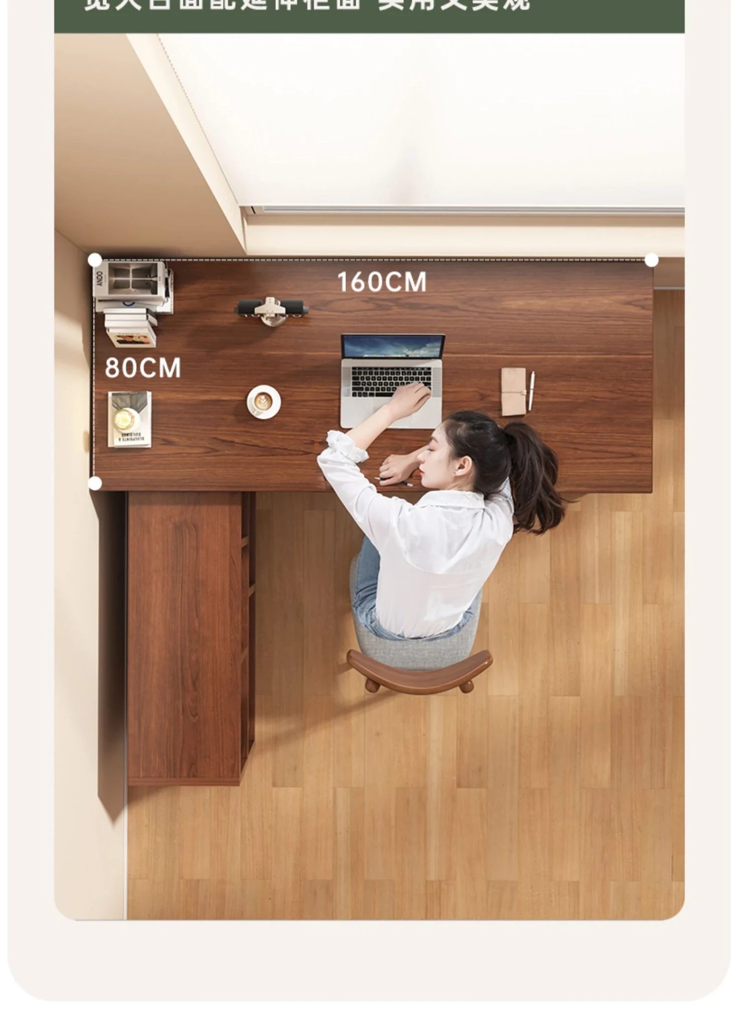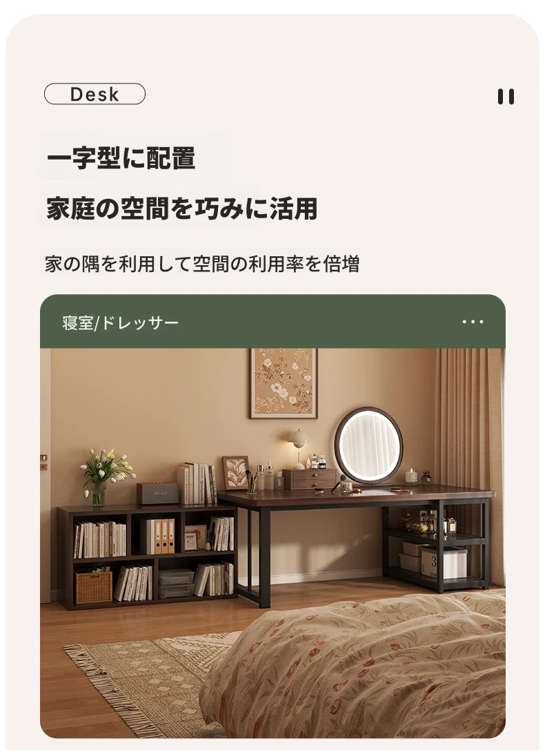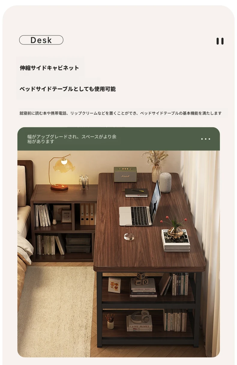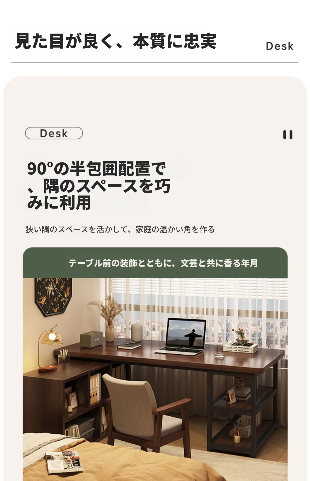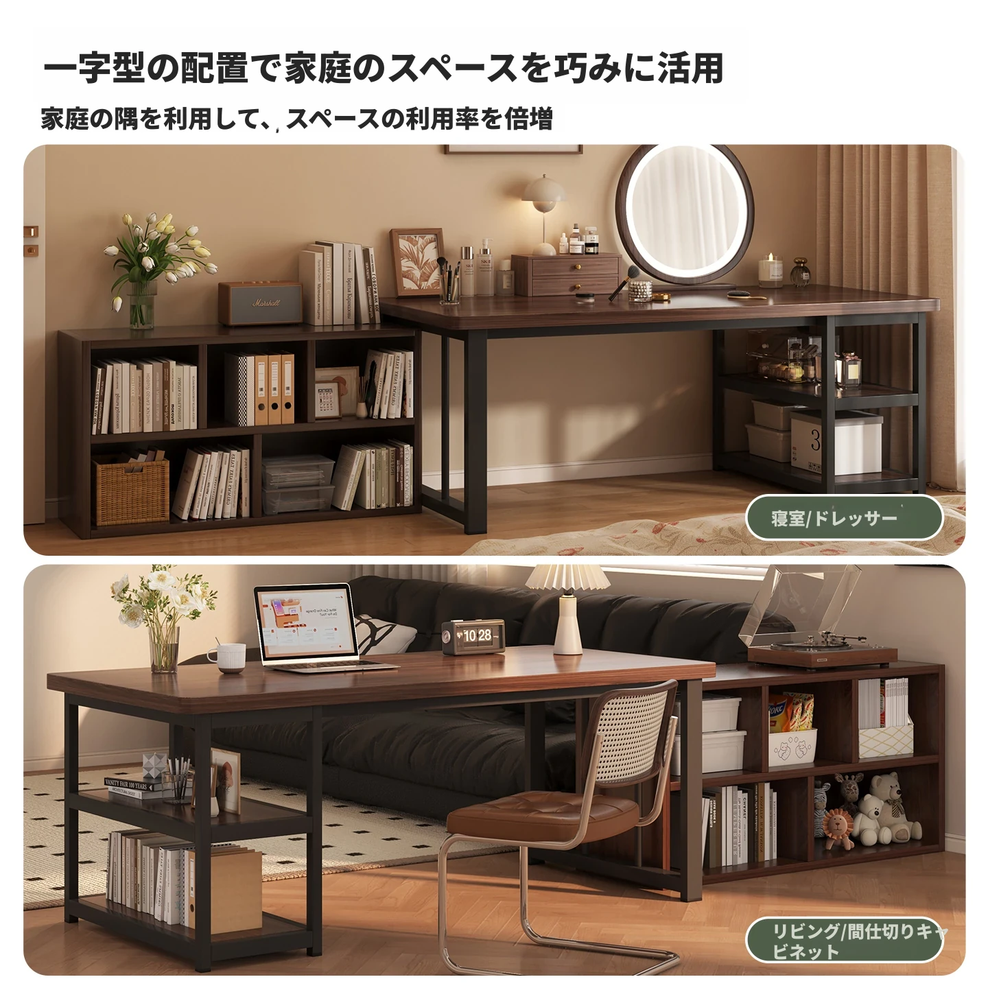 窓辺にぴったり!コーナーデスク&書棚一体型ワークステーション - スタイリッシュな収納付き、書きやすさ抜群のリビングや寝室に最適なデスク。快適な作業空間を実現!