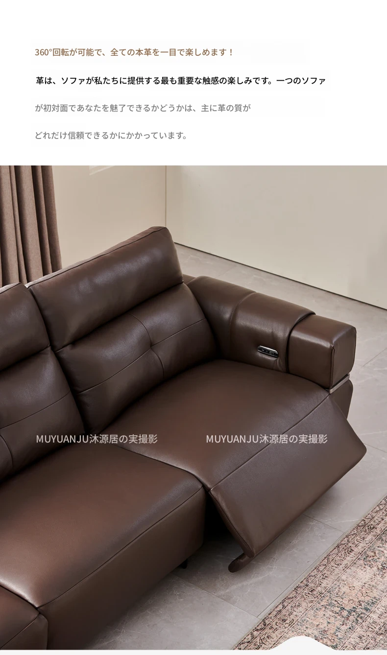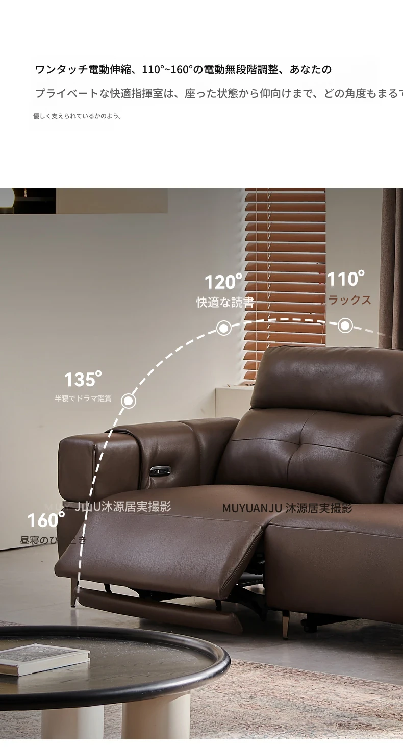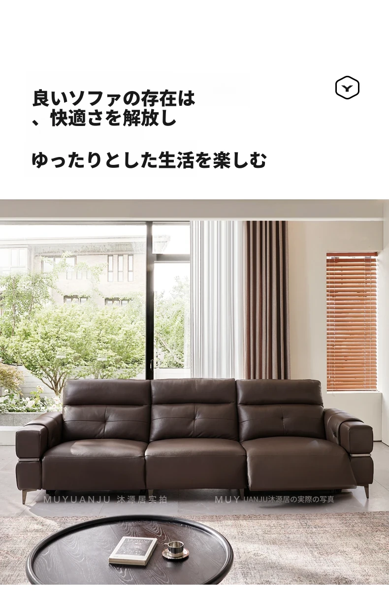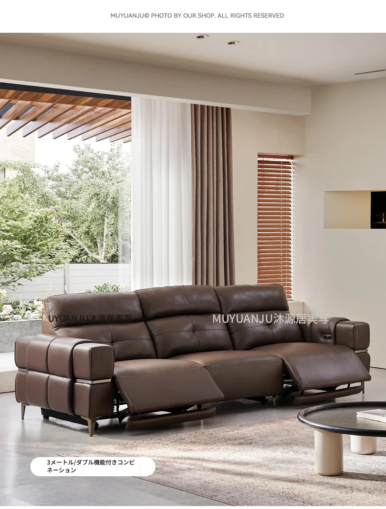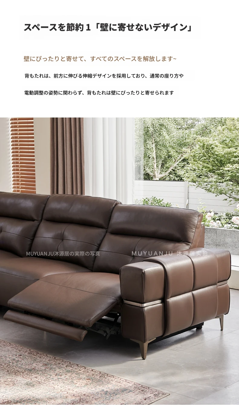 イタリアンスタイルの中古壁付け電動ヘッドレスト調整可能なリビング直線ソファ、寝転んでリラックスできる本革ソファ!快適なひとときをお約束します。