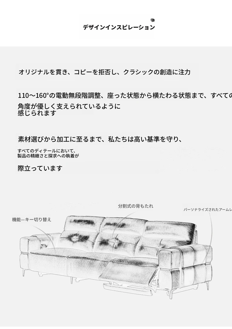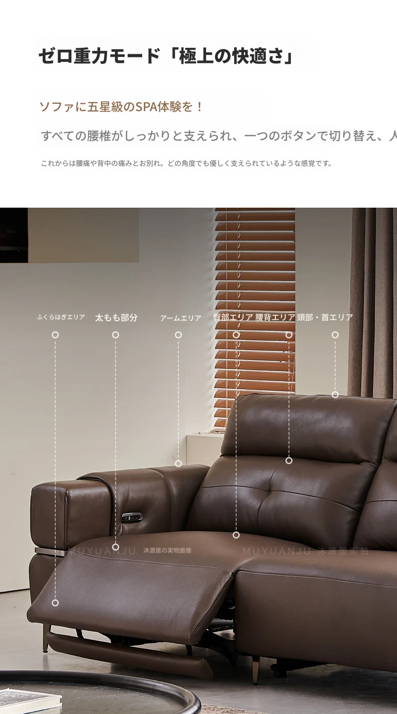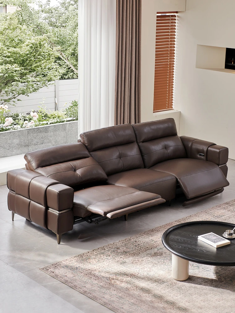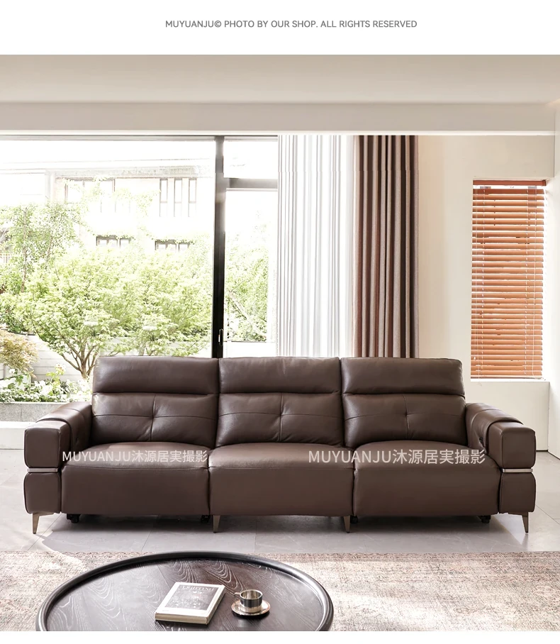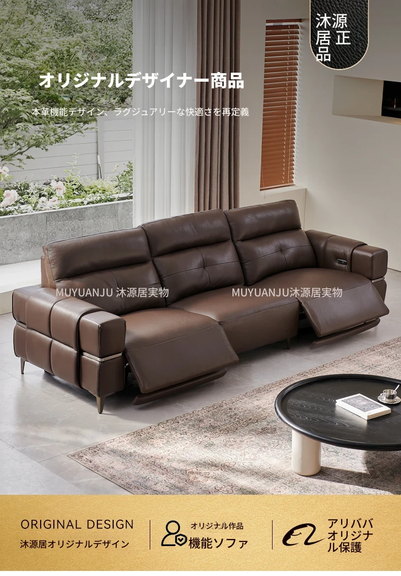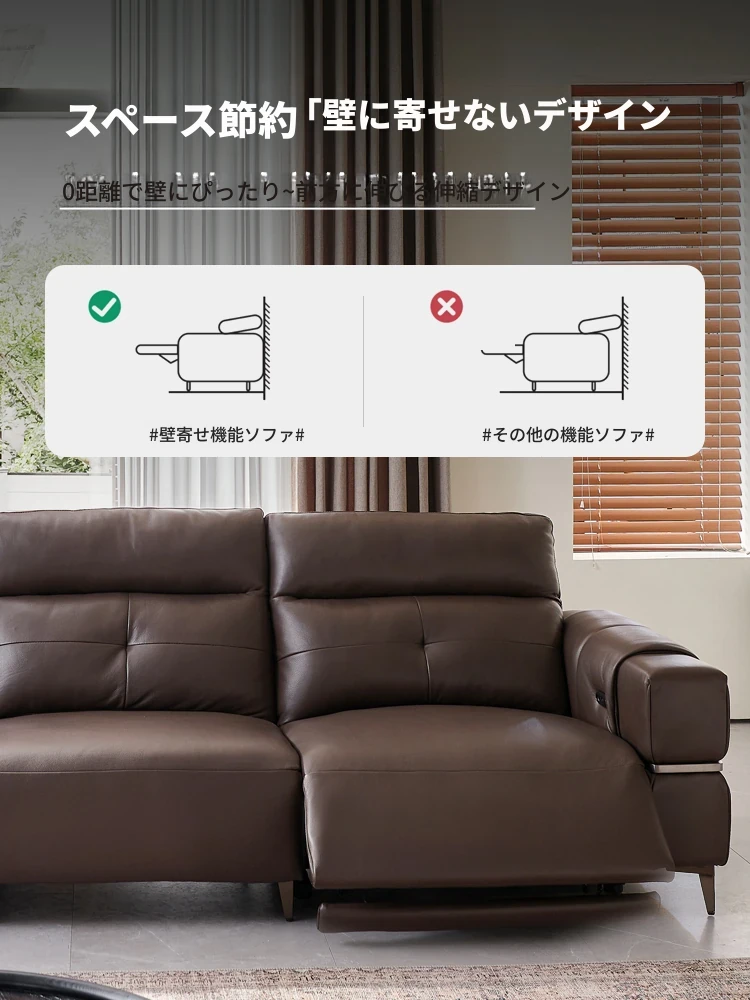 イタリアンスタイルの中古壁付け電動ヘッドレスト調整可能なリビング直線ソファ、寝転んでリラックスできる本革ソファ!快適なひとときをお約束します。