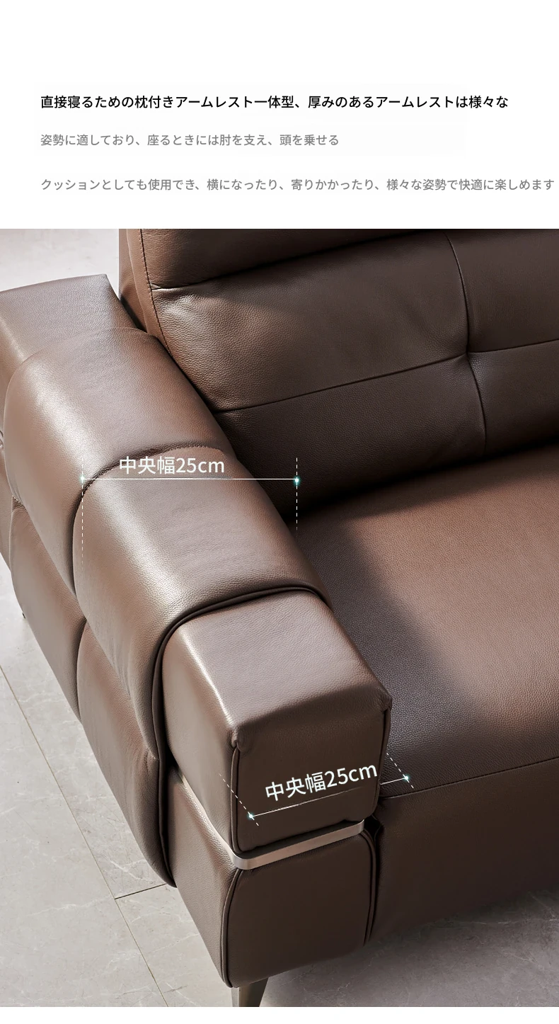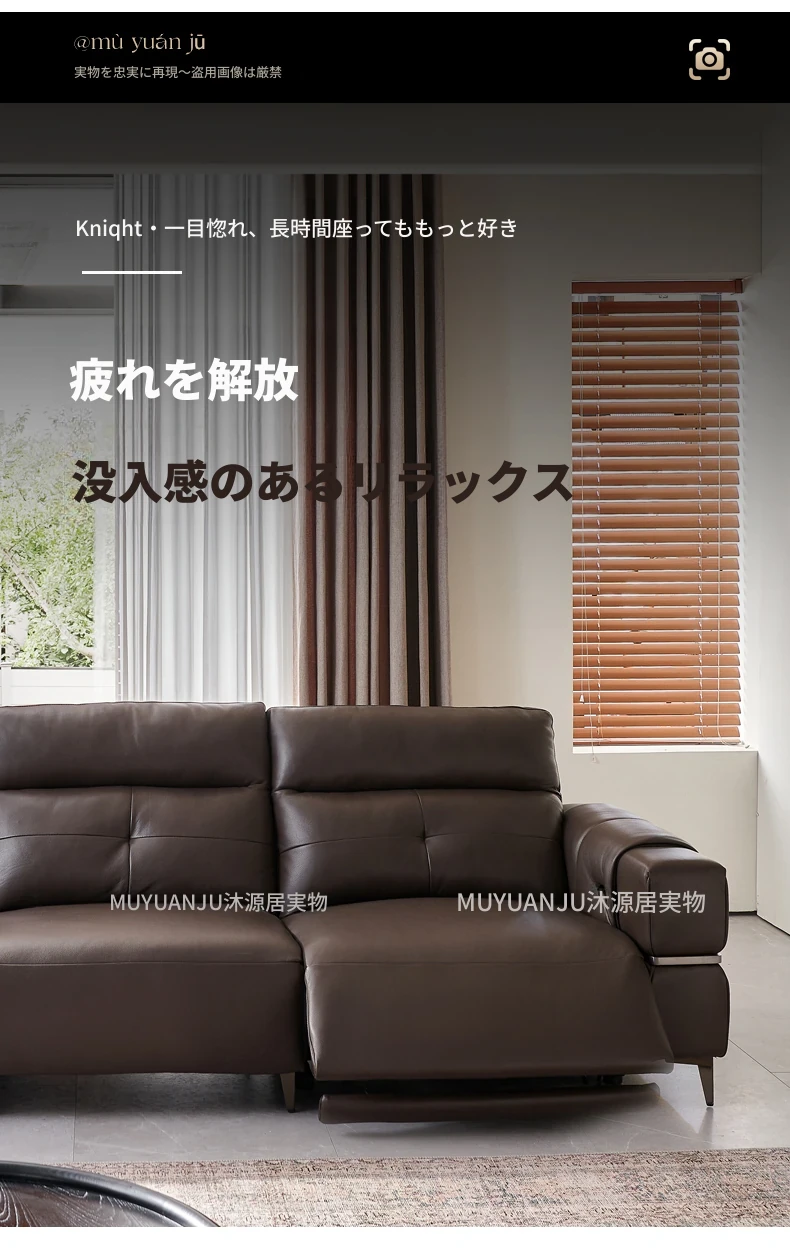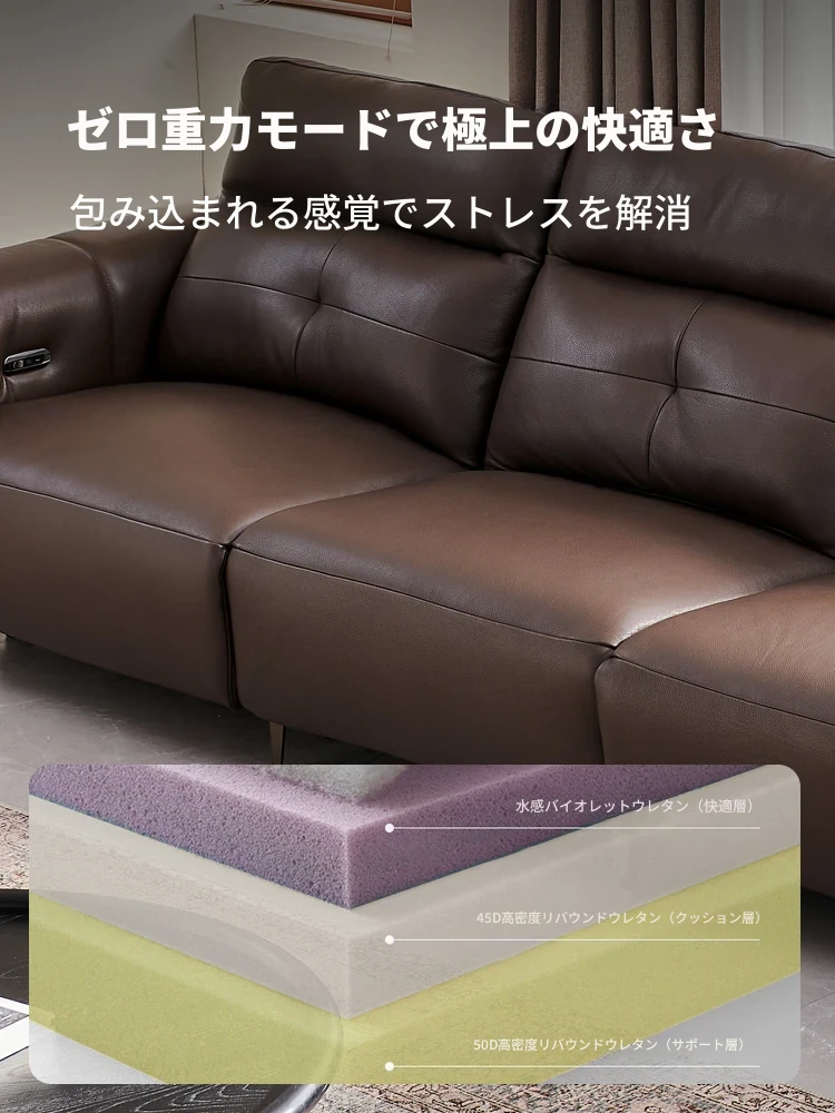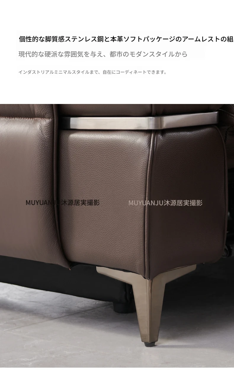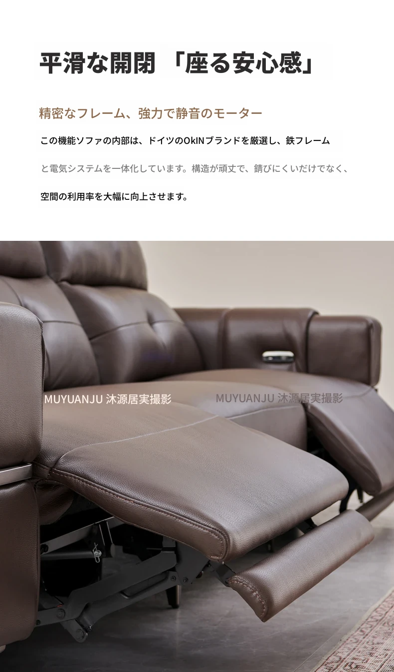 イタリアンスタイルの中古壁付け電動ヘッドレスト調整可能なリビング直線ソファ、寝転んでリラックスできる本革ソファ!快適なひとときをお約束します。