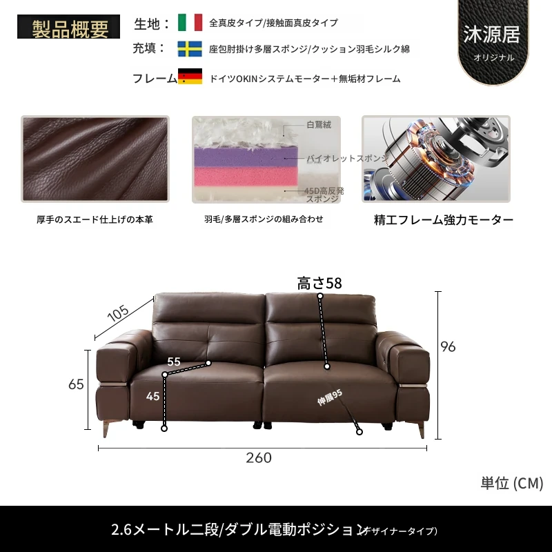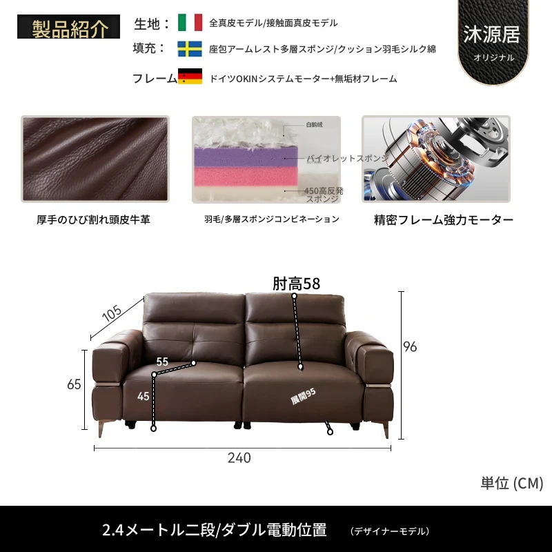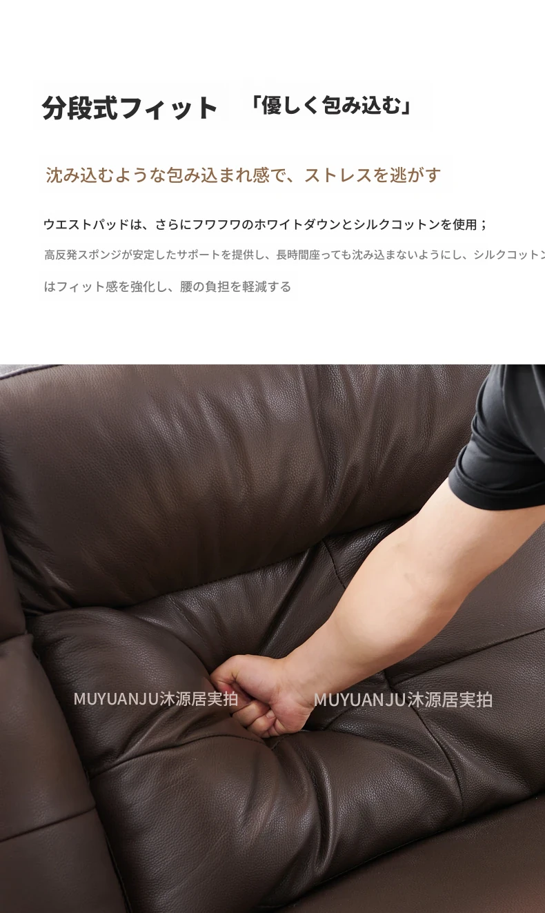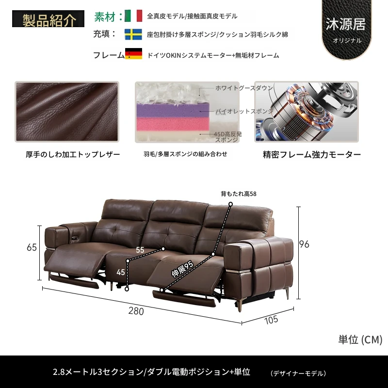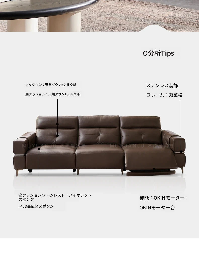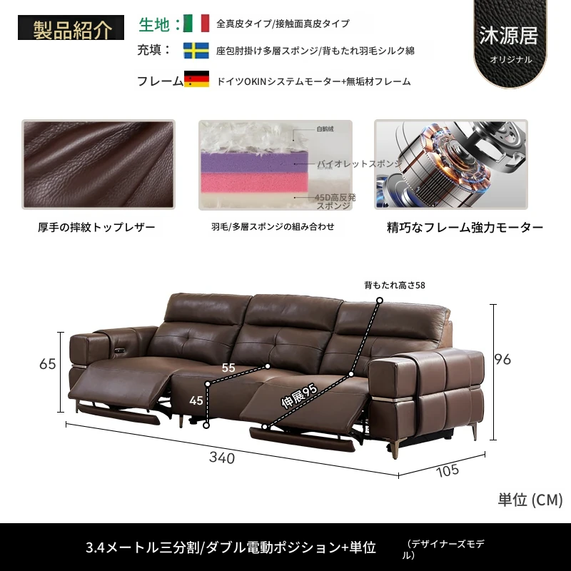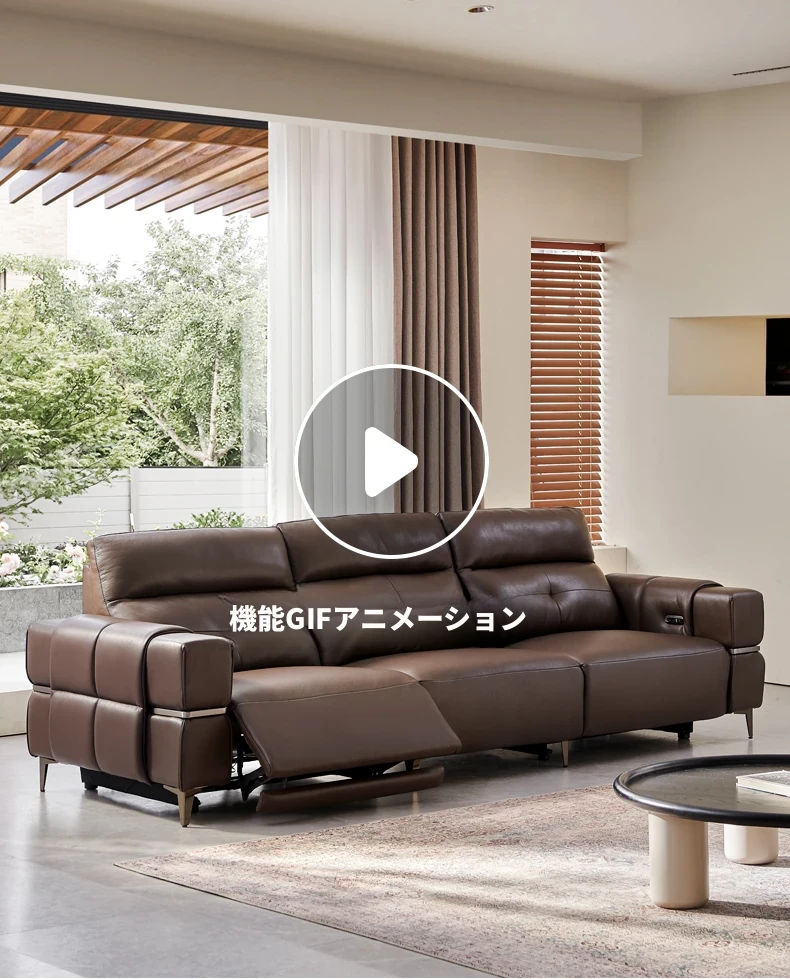 イタリアンスタイルの中古壁付け電動ヘッドレスト調整可能なリビング直線ソファ、寝転んでリラックスできる本革ソファ!快適なひとときをお約束します。