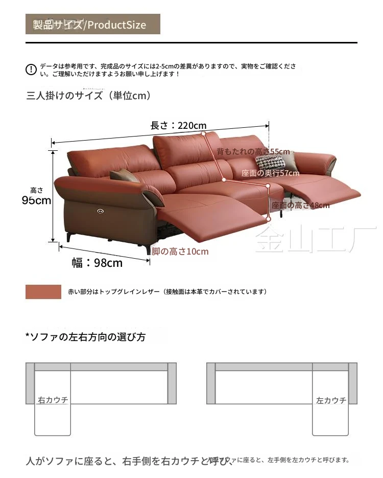 【厚手のトップグレイン牛革全カバー】2.2メートル三人用【左右電動】