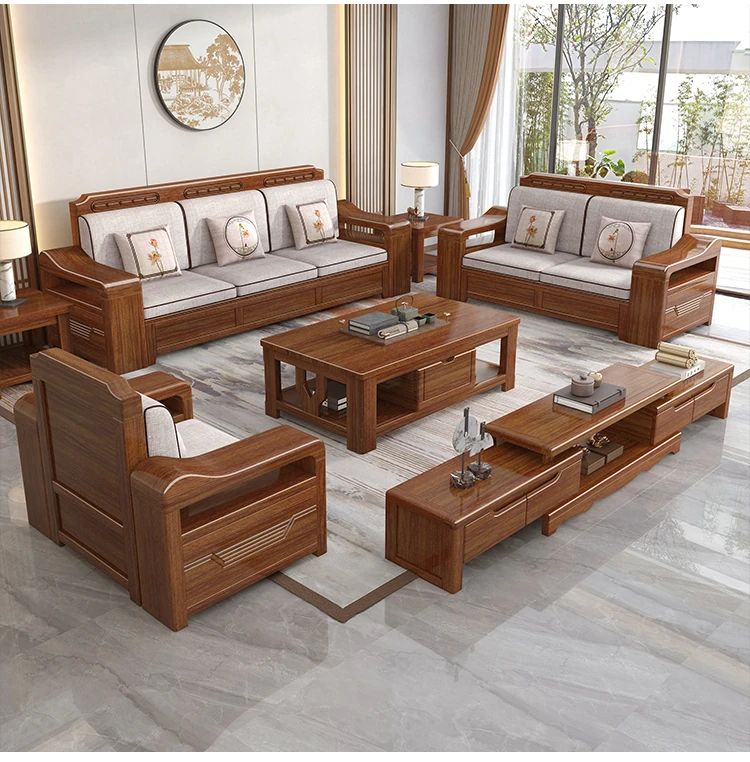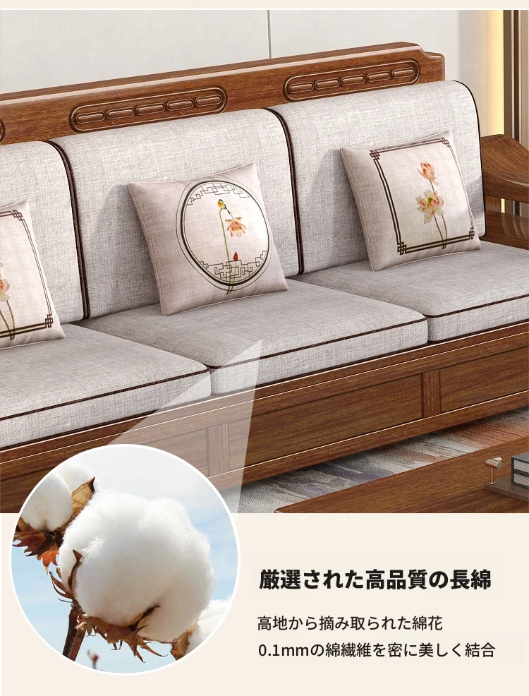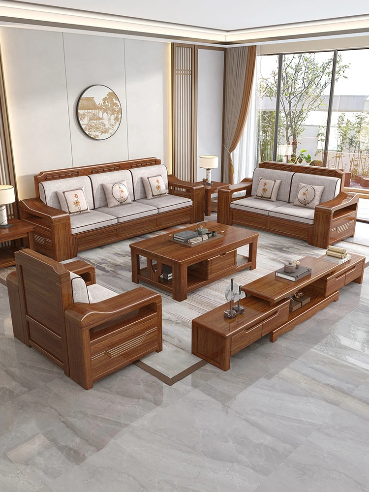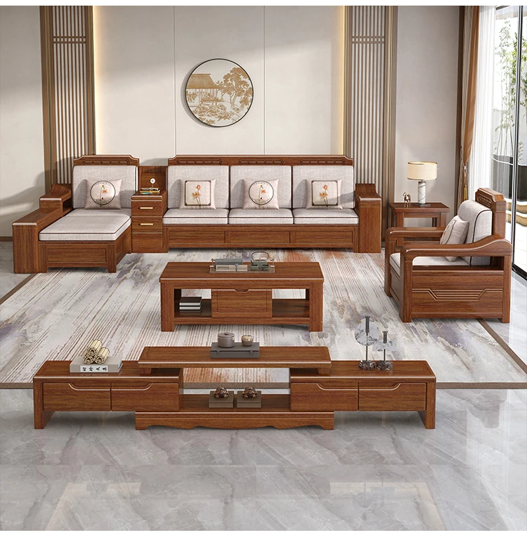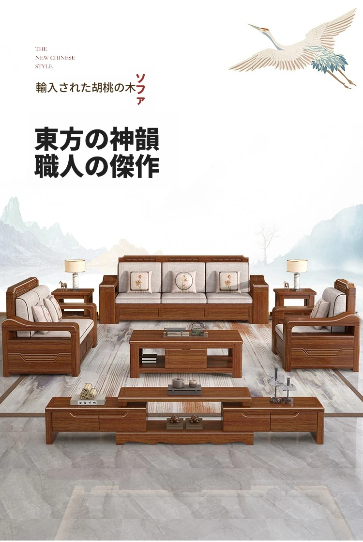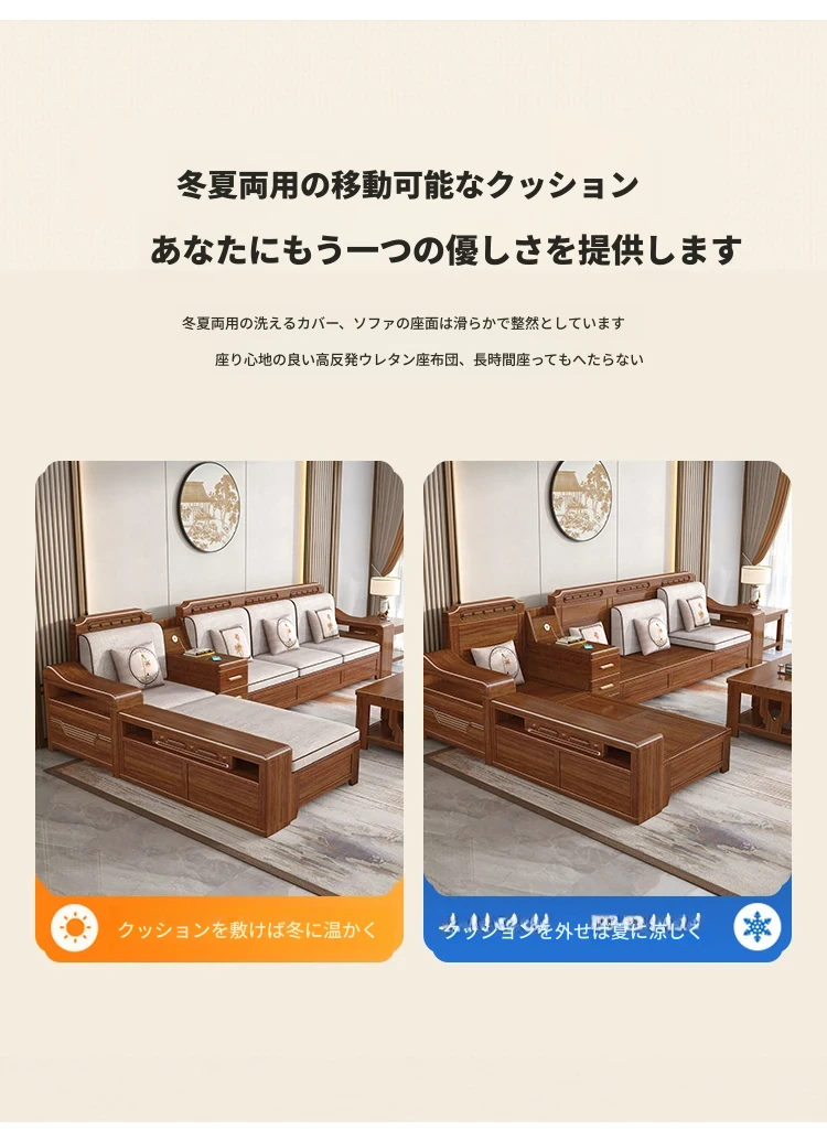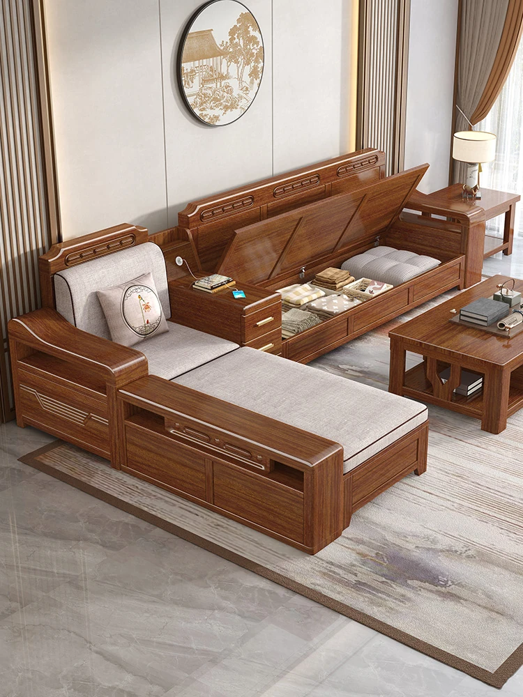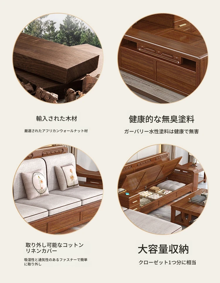 新中式スタイルの無垢材ソファセット - シンプルなゴールデンウォールナット材使用、収納機能付きでリビングをスタイリッシュに演出!全て無垢材で耐久性抜群!