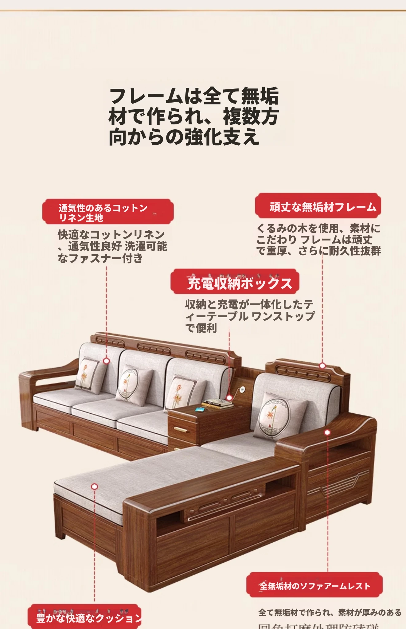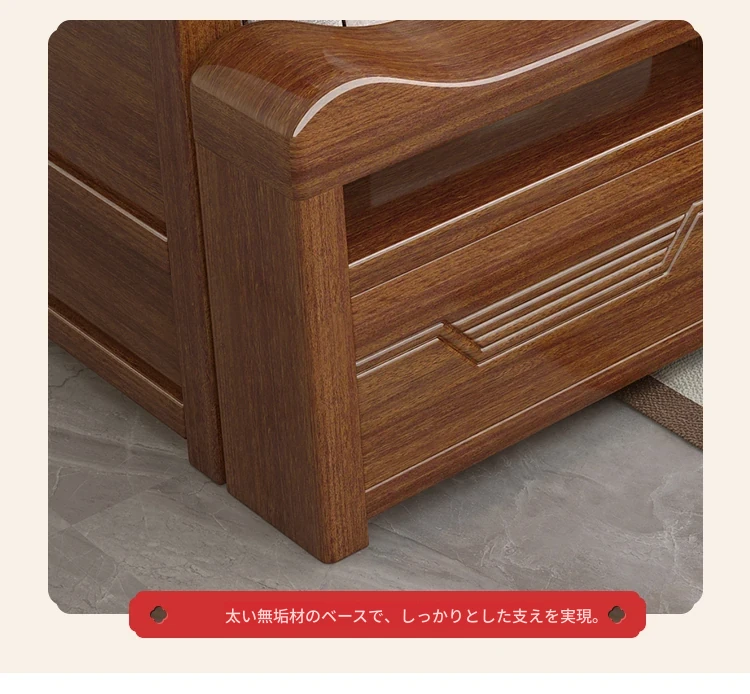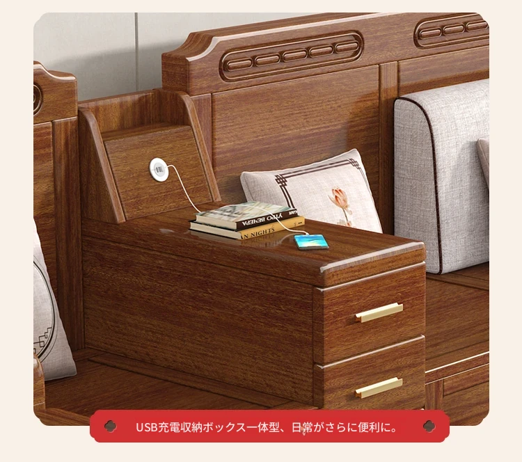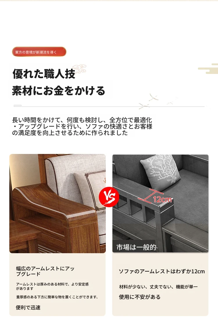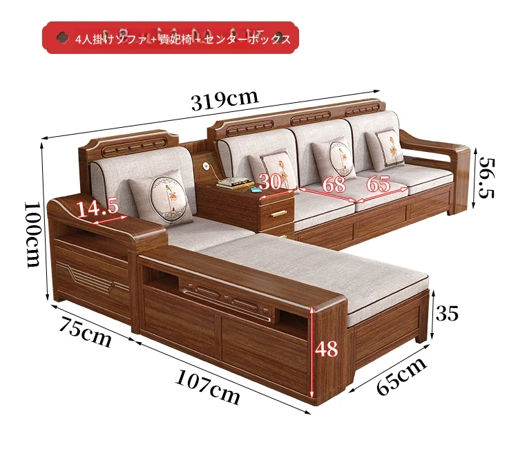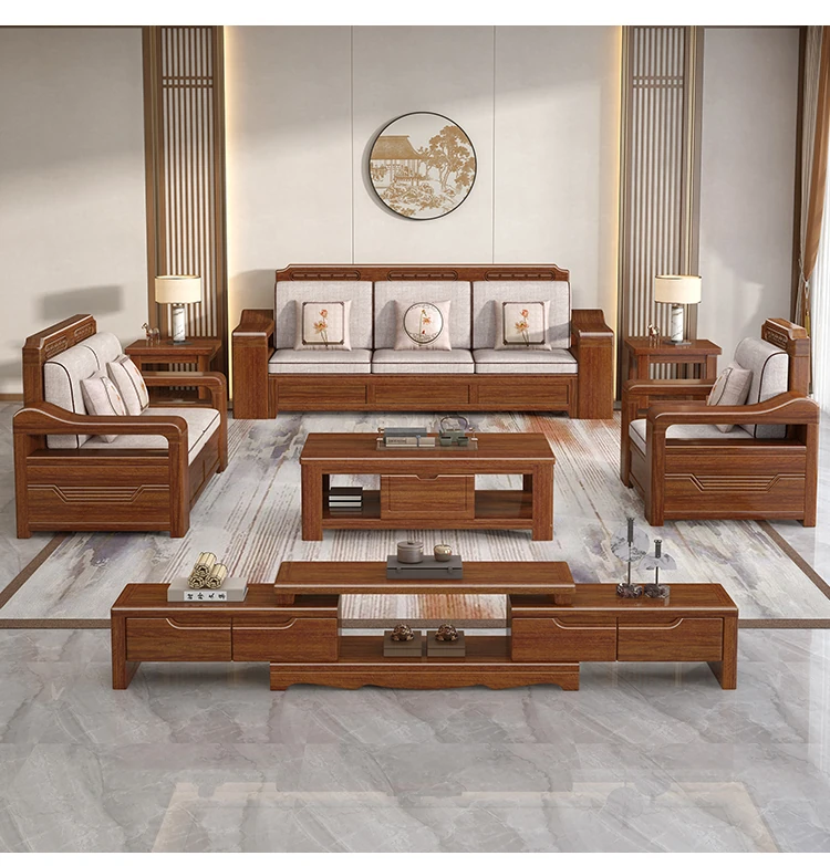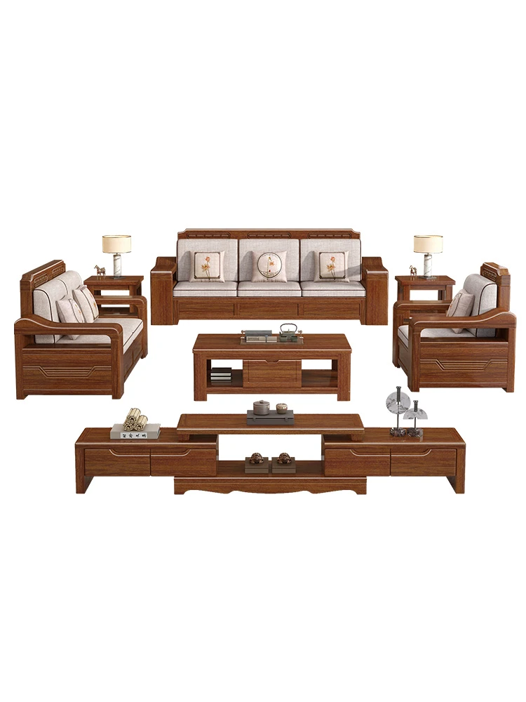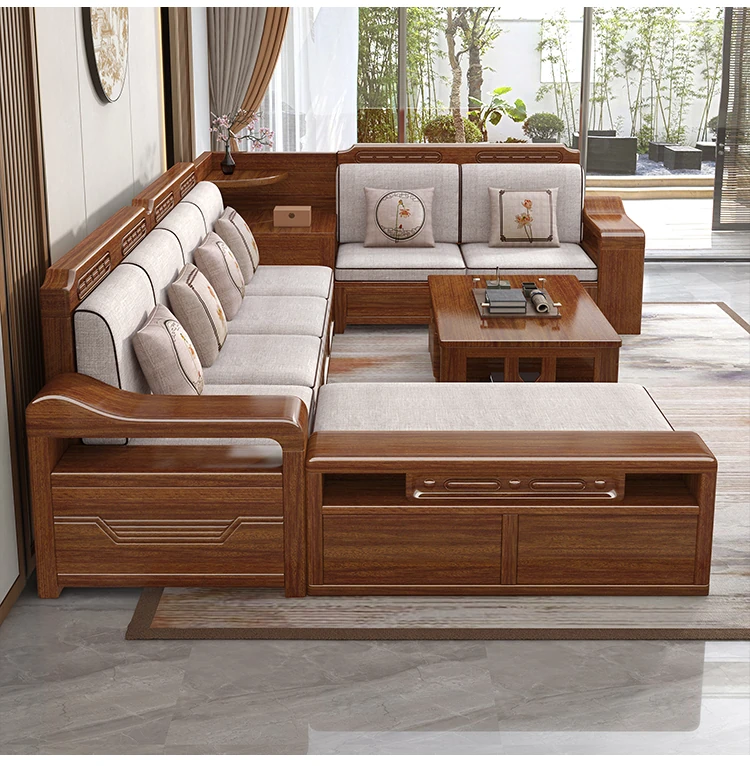 新中式スタイルの無垢材ソファセット - シンプルなゴールデンウォールナット材使用、収納機能付きでリビングをスタイリッシュに演出!全て無垢材で耐久性抜群!