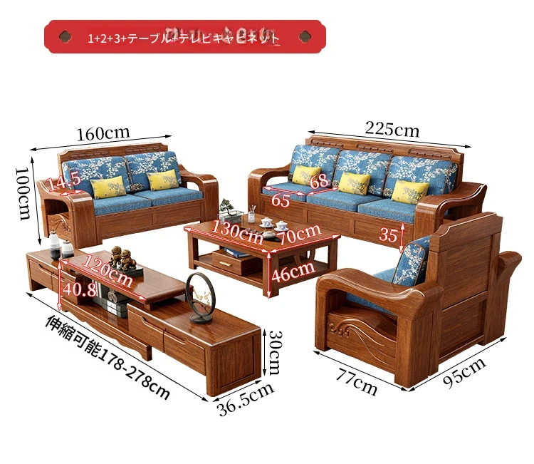 五人掛け+貴妃椅+テーブル+茶台 【金色の胡桃】
