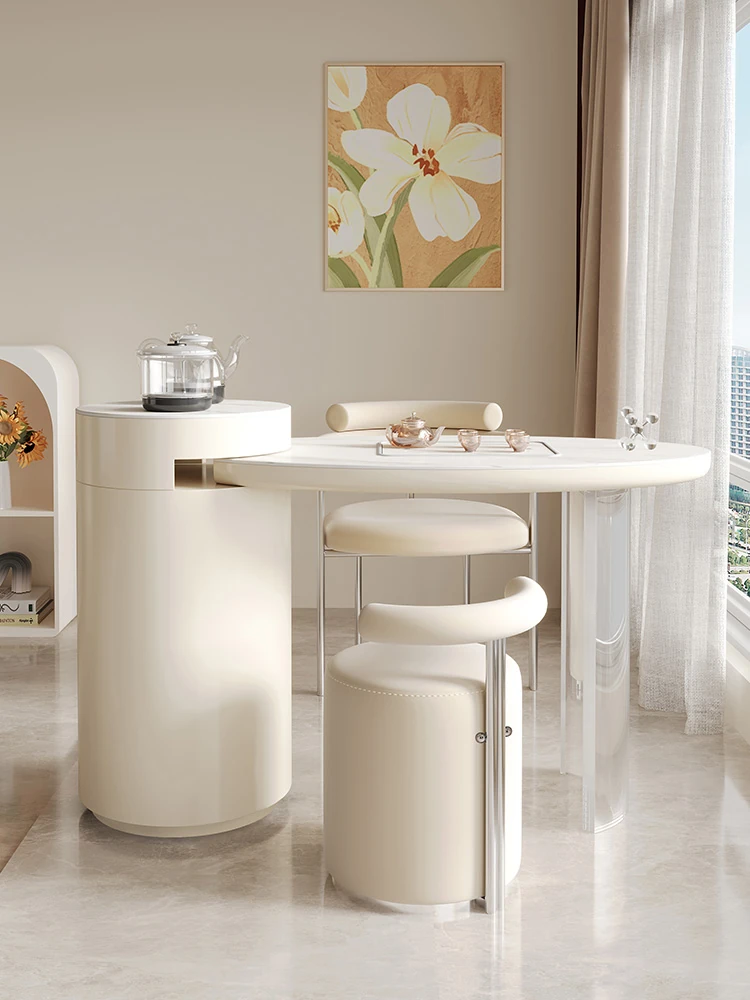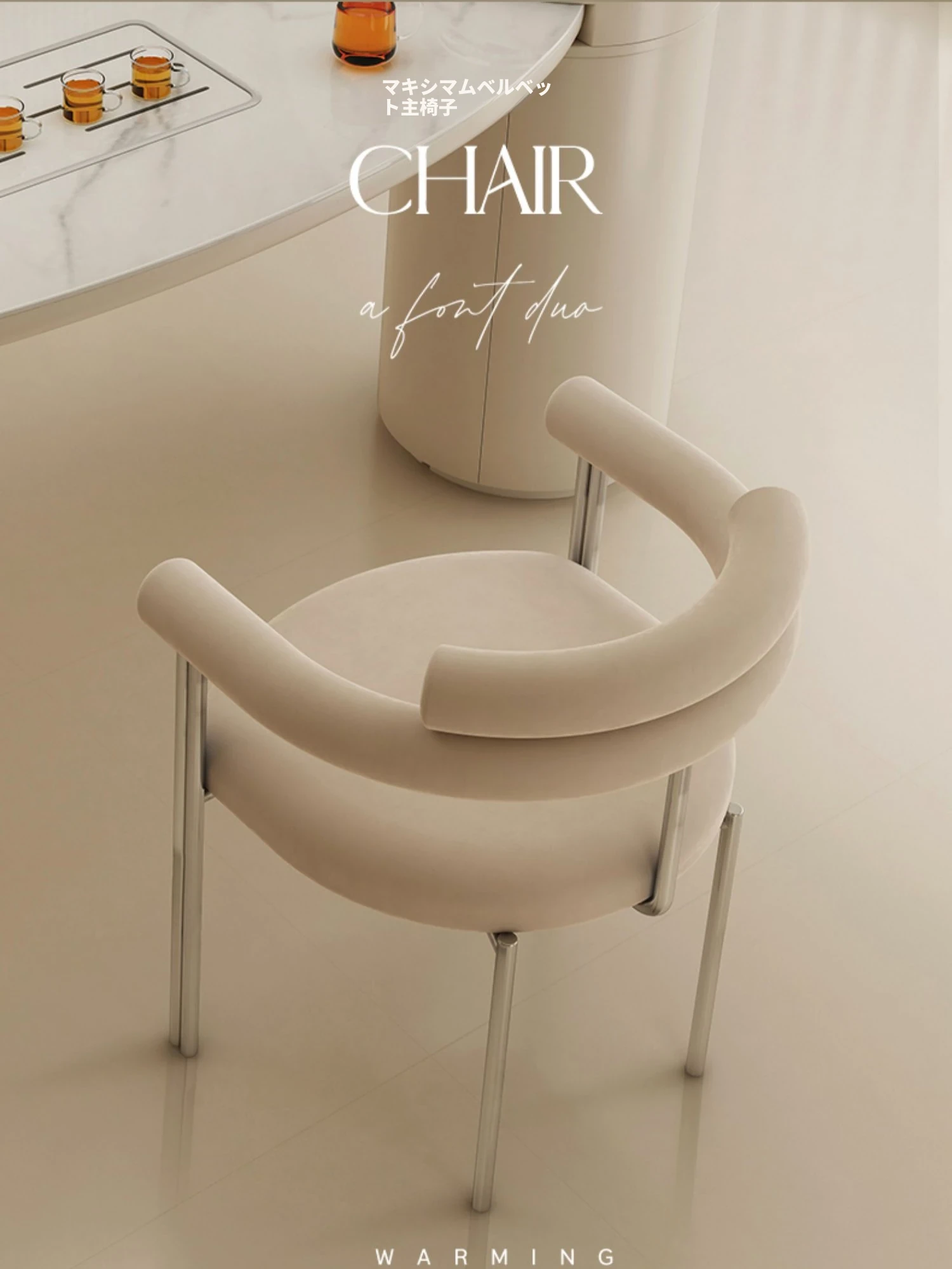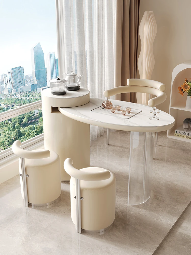 モダンでラグジュアリーな軽量アームチェア付きティーテーブルセット - シンプルなステンレススチール製、リラックスできるクリームトーンのオフィス用ティーテーブルと主役の椅子。快適さとスタイルを兼ね備えた完璧な選択!