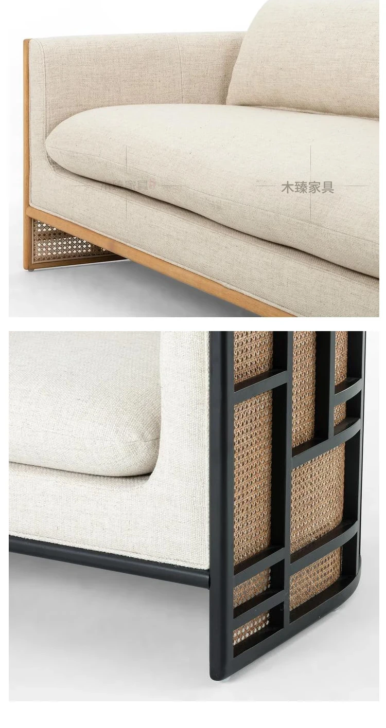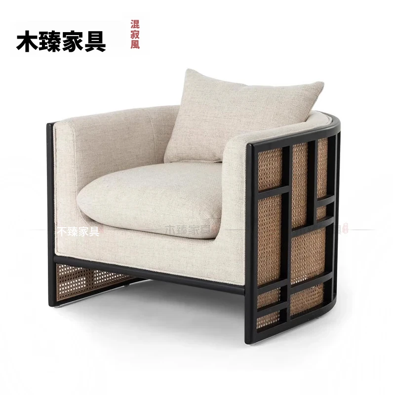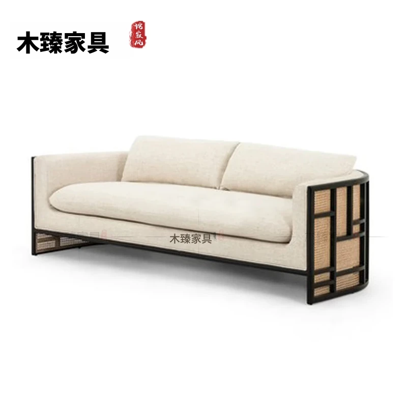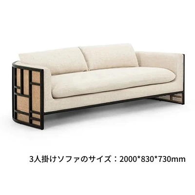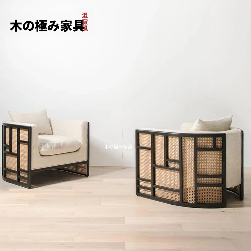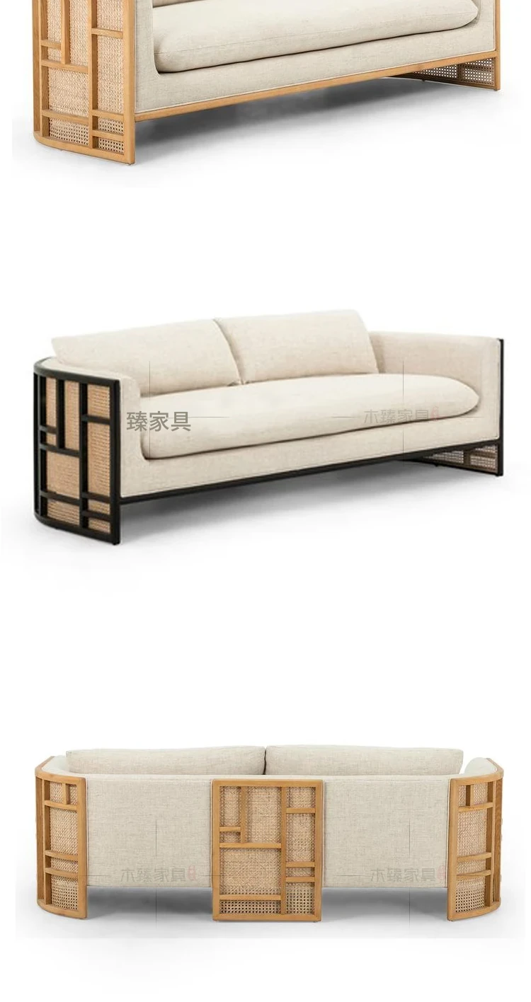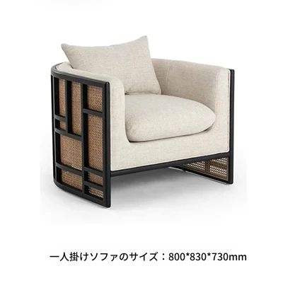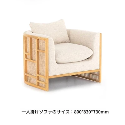 新中式スタイルの無垢材ソファセット - シンプルでモダンなデザイン、ホテルや民宿に最適!東南アジアの原木色と籐編みの家具で、心地よい空間を演出。