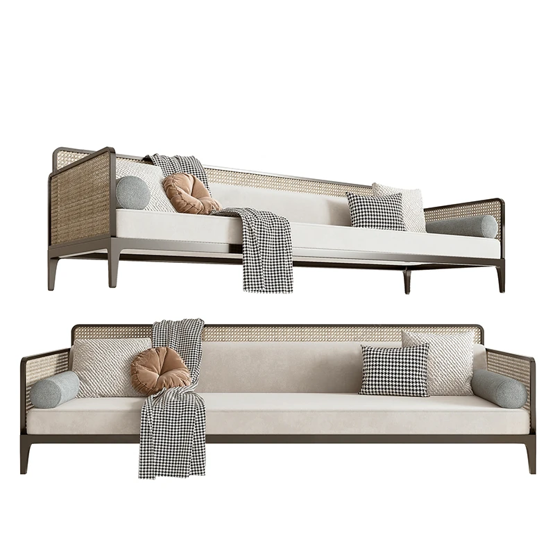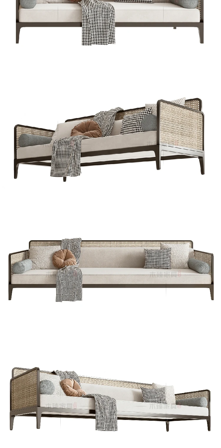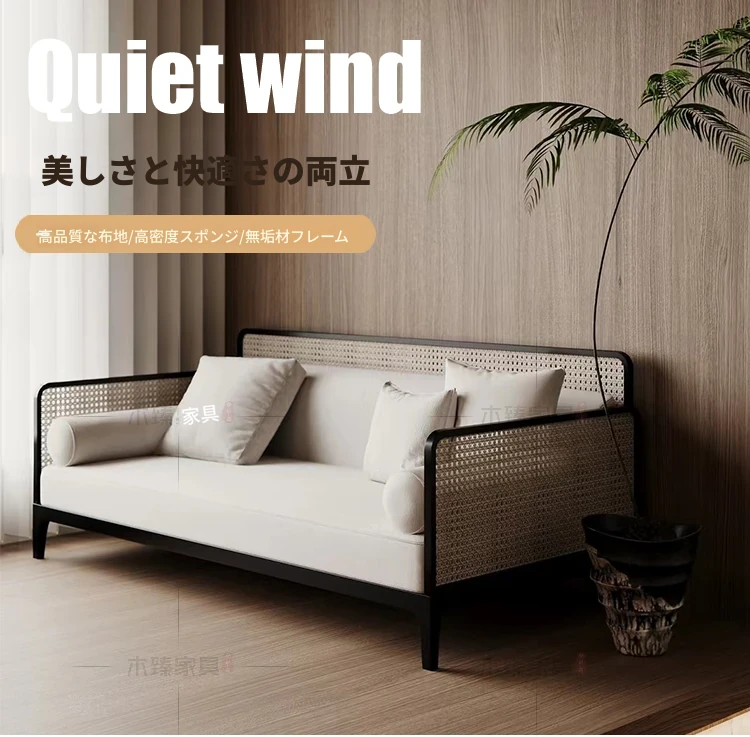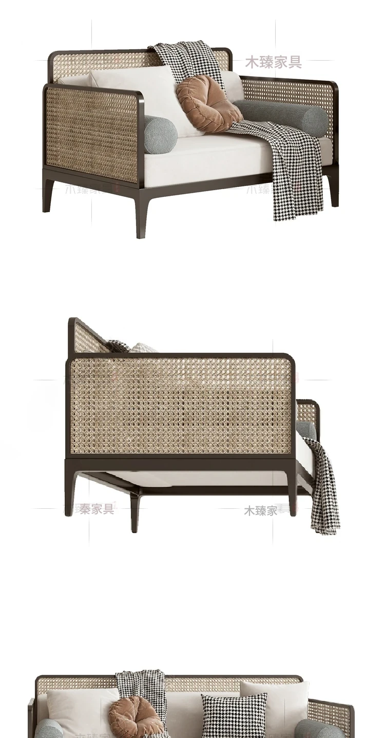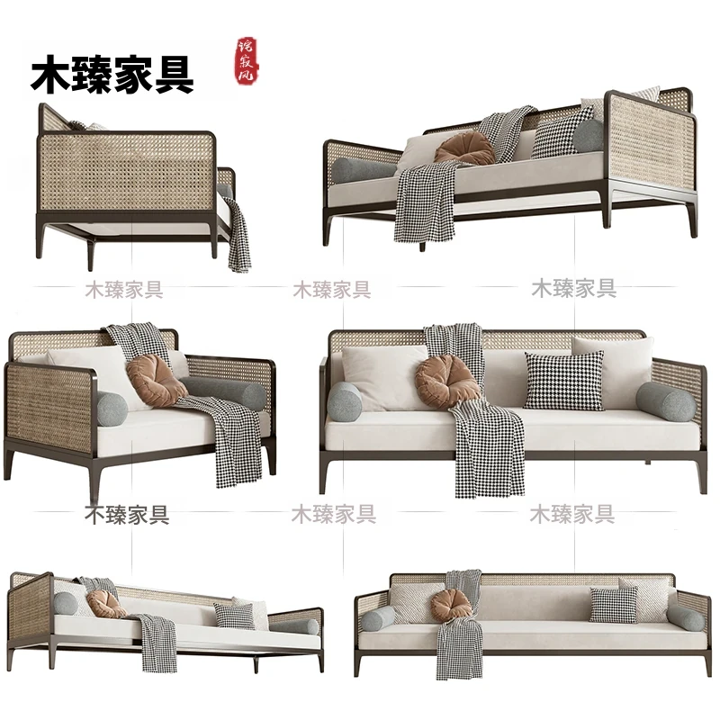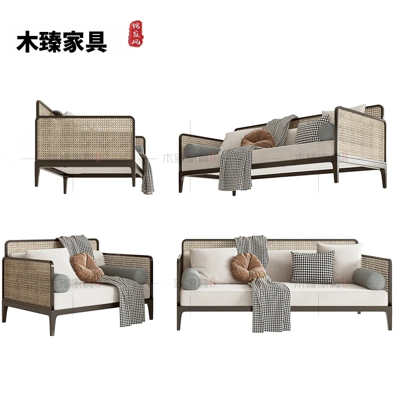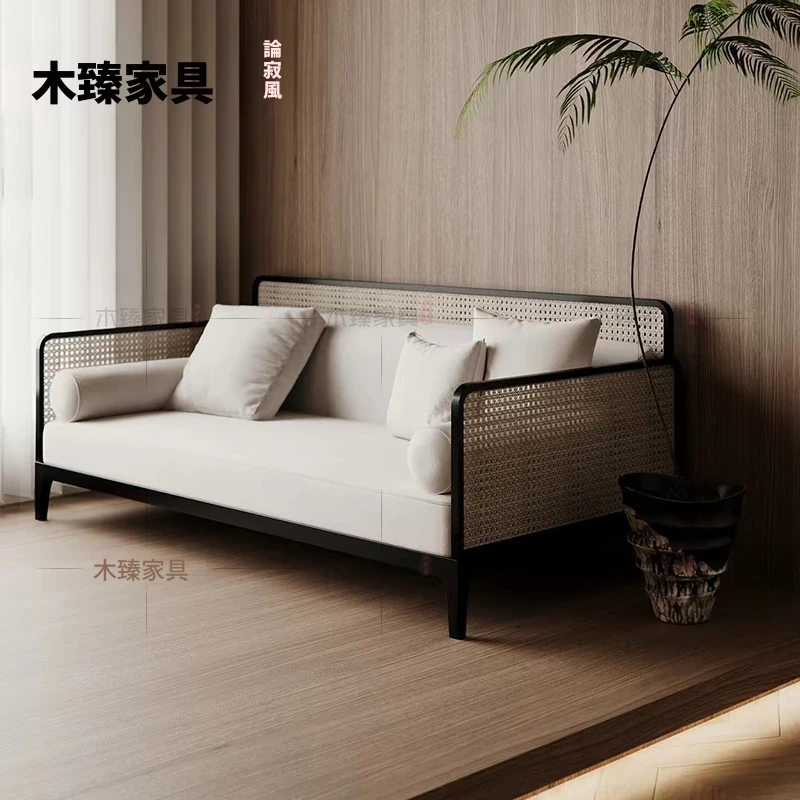 新中式スタイルの無垢材と籐編みのソファ - 北欧モダン茶室・会所の休憩エリアに最適!ホテルロビーや商談スペースにもぴったりなデザインで、上質な寛ぎを提供します。