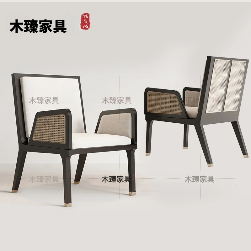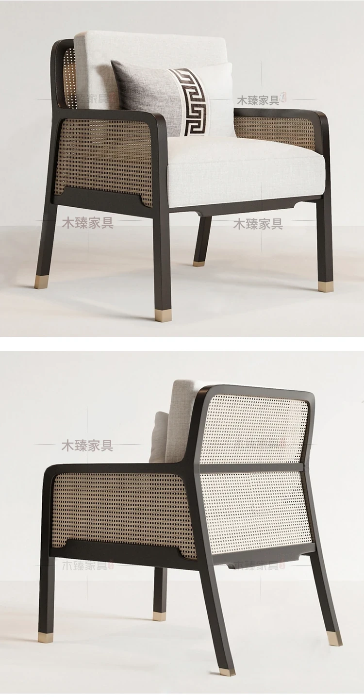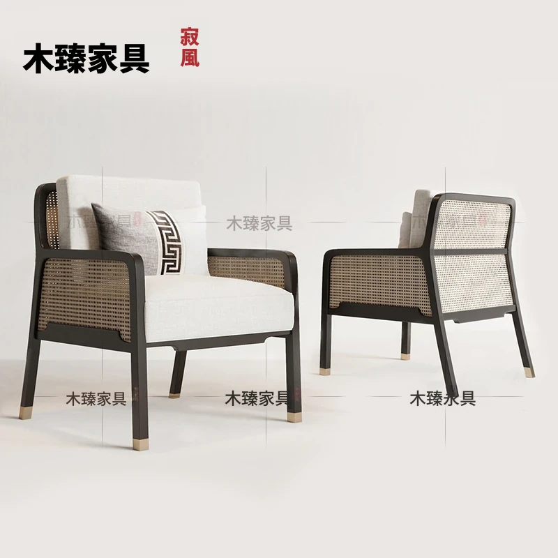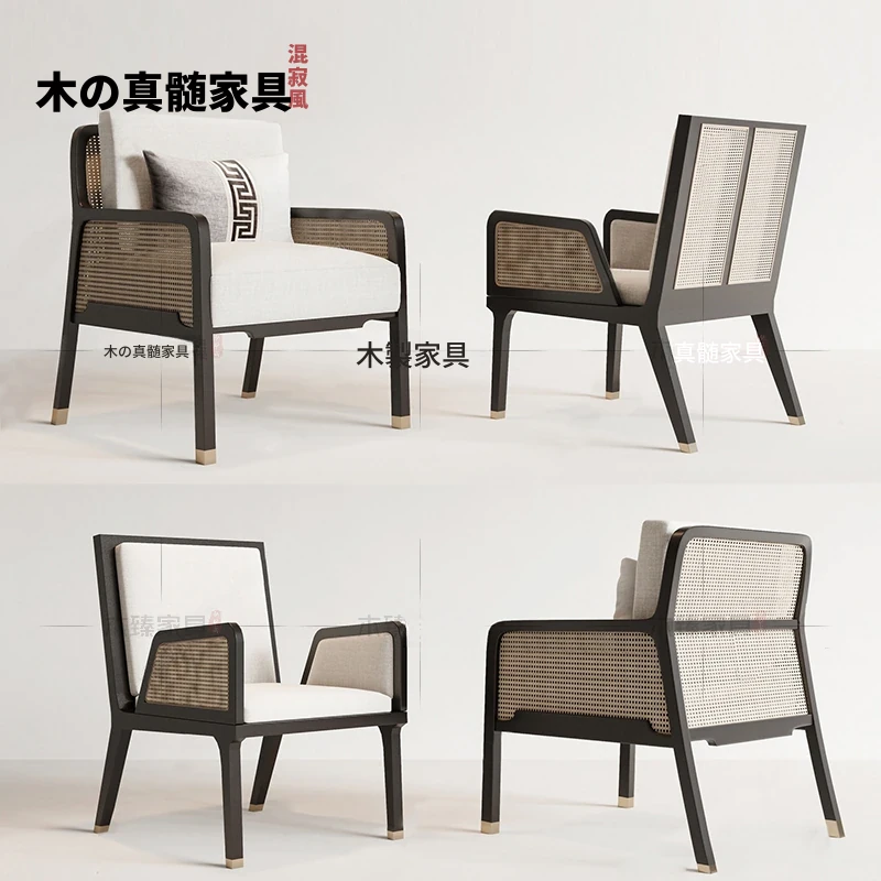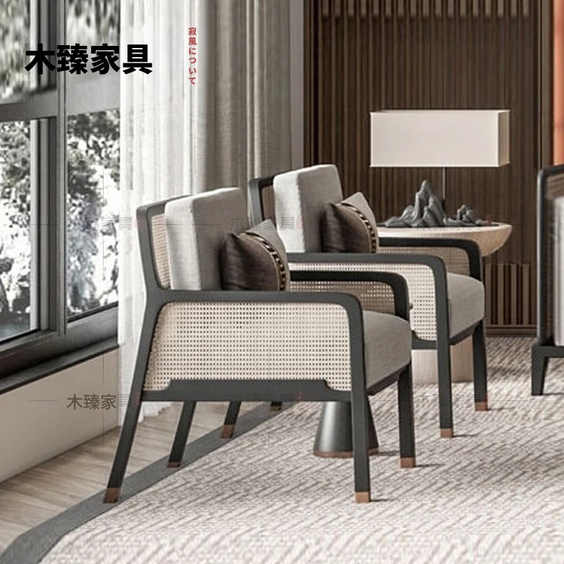 北欧ミニマリズムのラタン編みソファチェア - わびさび風の一人用リラックスチェア。新中式デザインで、ホテルや会所、販売所での商談に最適!シンプルながらも洗練された美しさをお楽しみください。