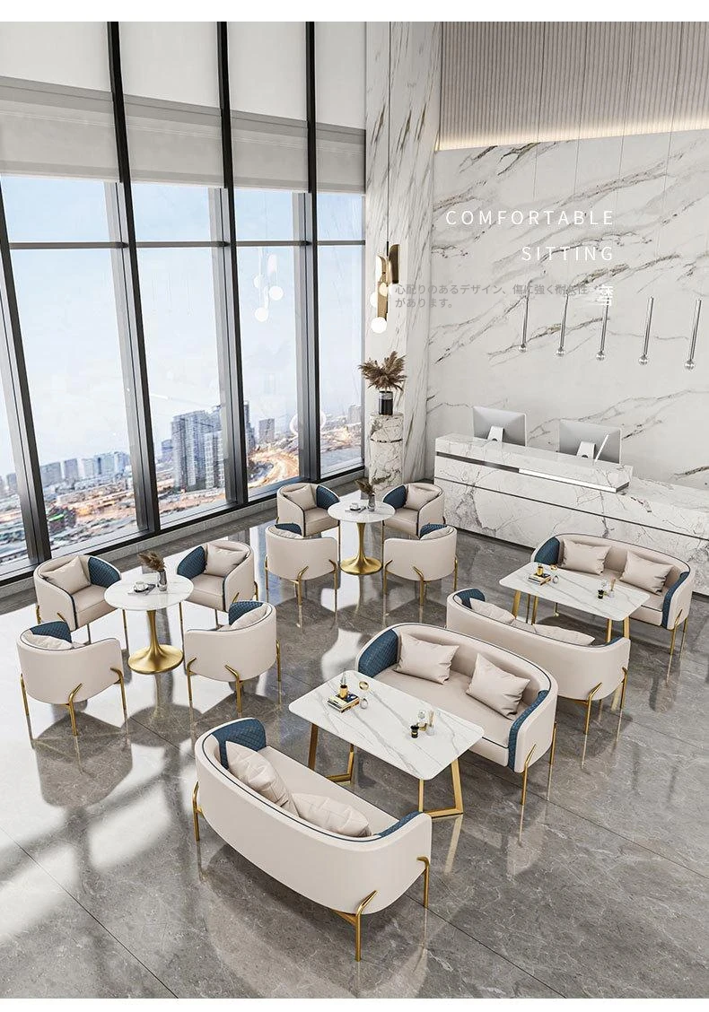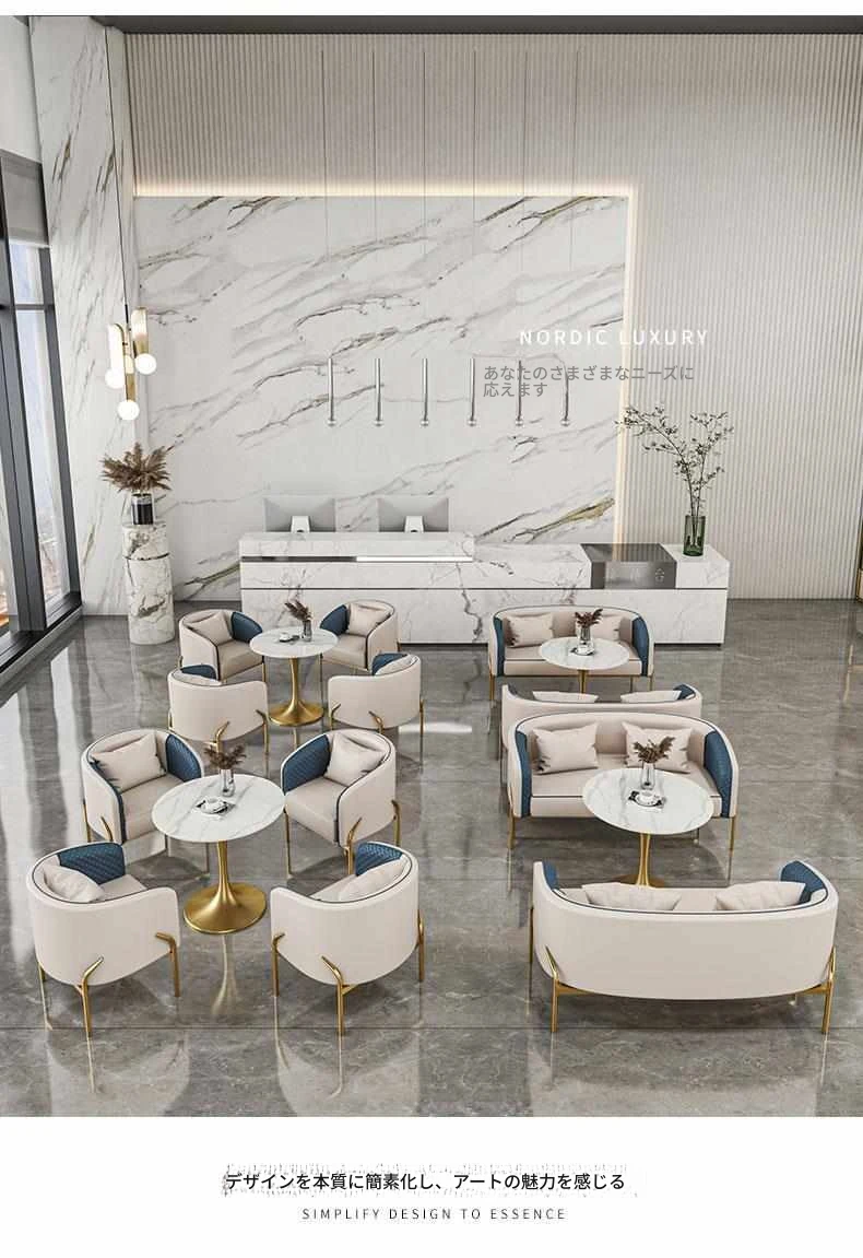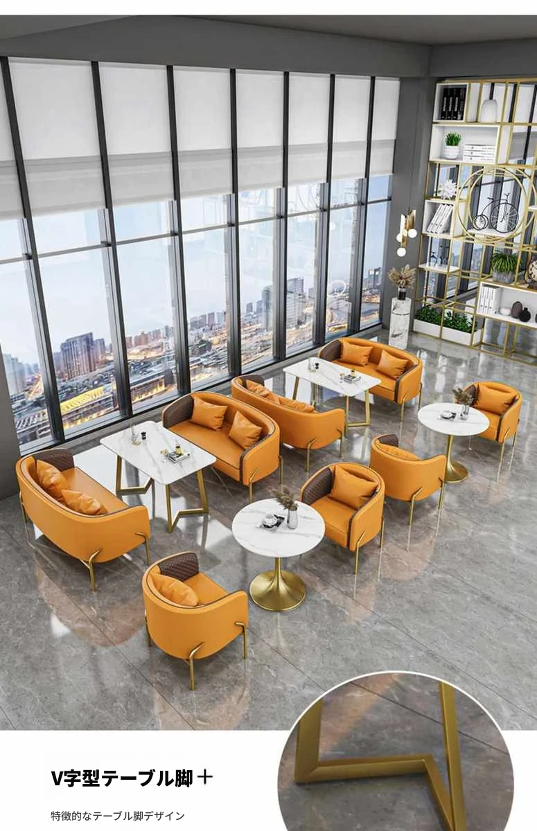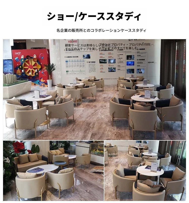 北欧スタイルのカジュアルソファチェア - 展示会やカフェ、販売所にぴったり!高級感のあるデザインで、影響力のある接客空間を演出します。おしゃれなデザインと快適さを兼ね備えた、理想的なテーブル&チェアセット。