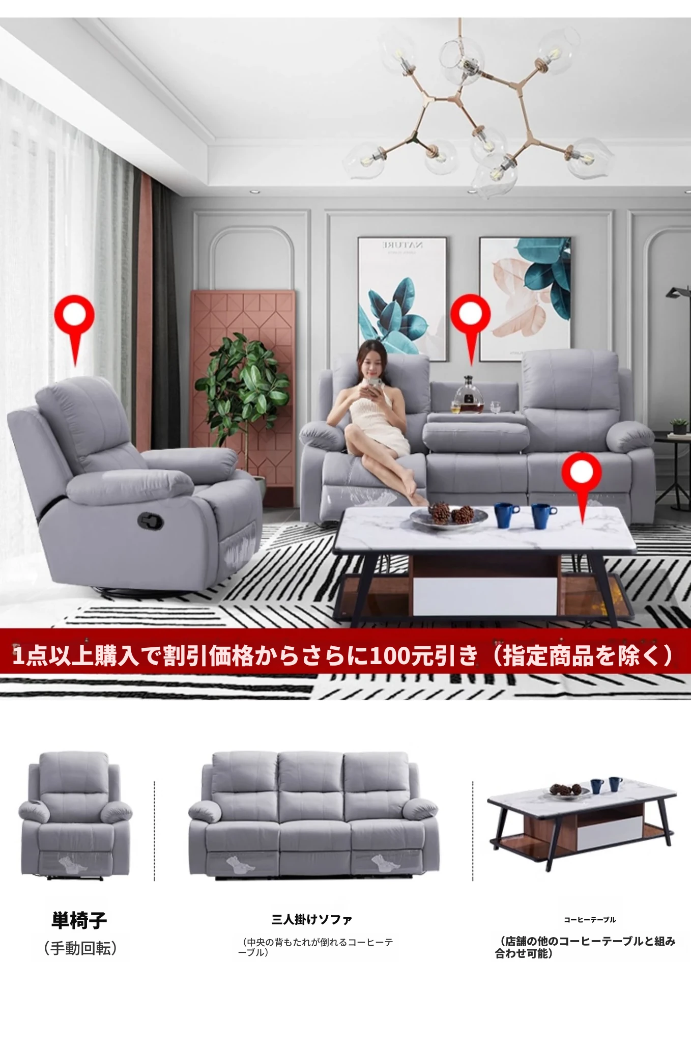 スリーシート両側手動ストレッチ+固定中間背もたれ多機能テーブル