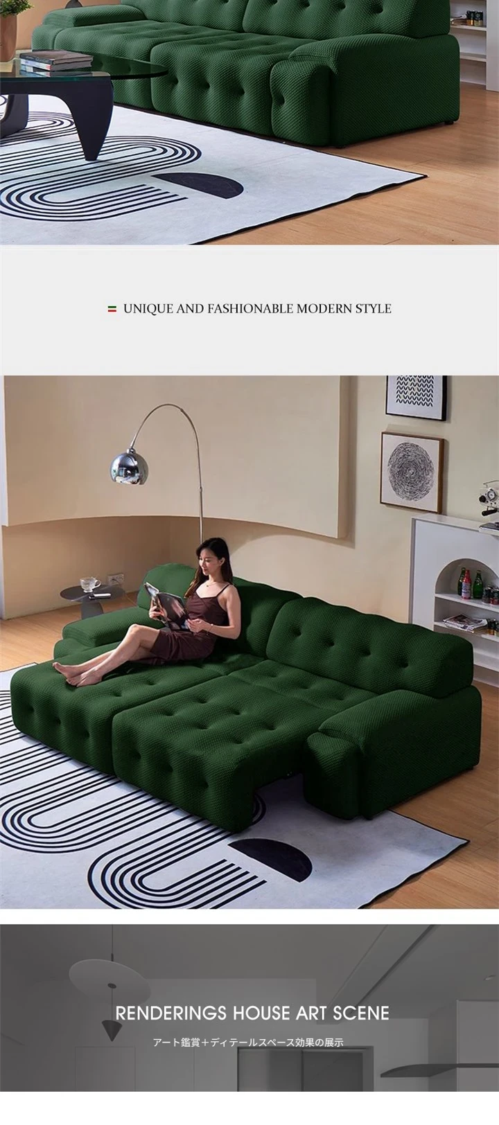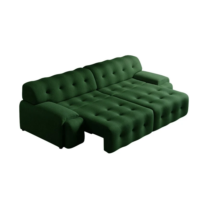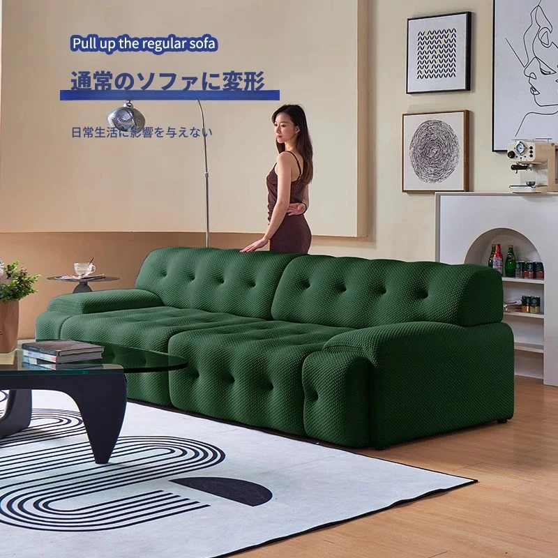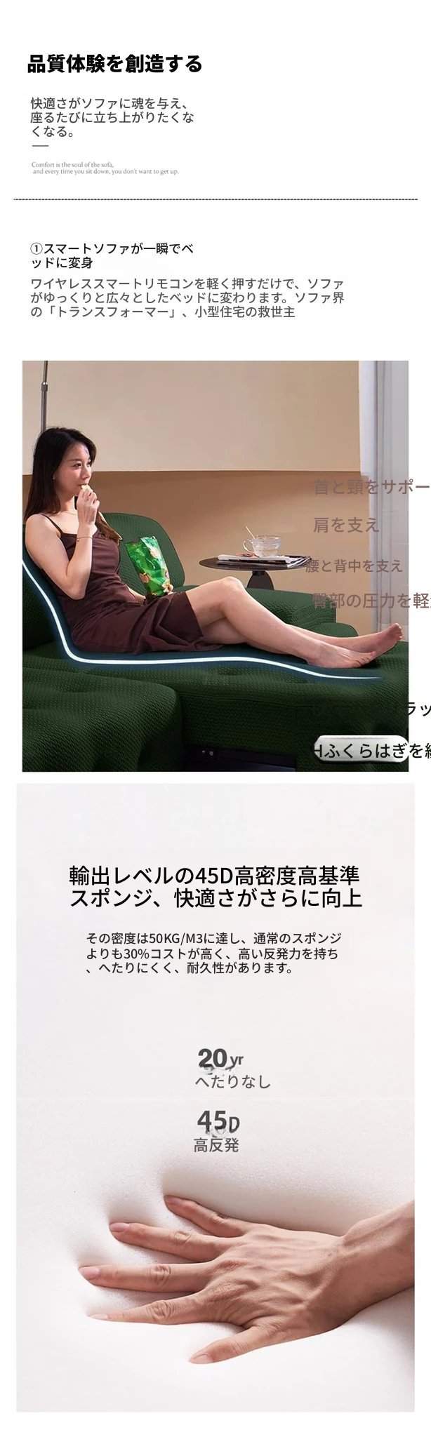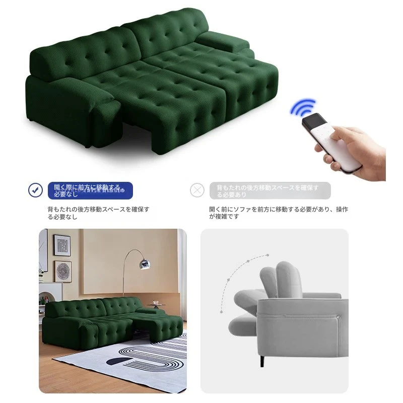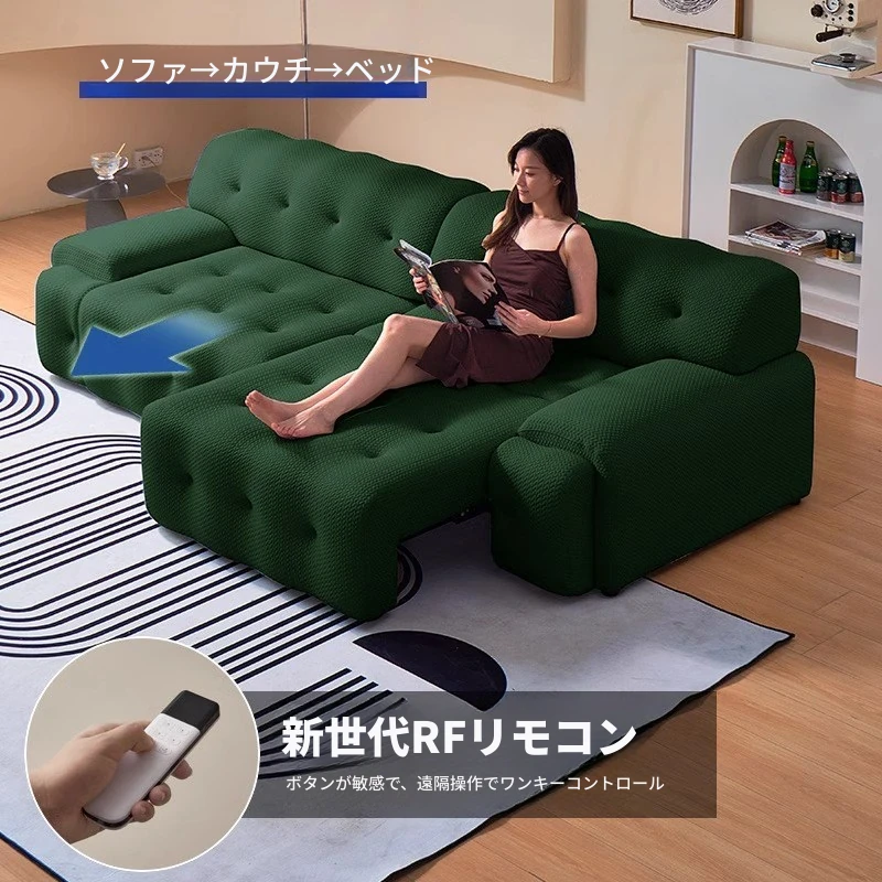 ローチバー電動ソファベッド|リビングに最適!壁に寄せられるスリムデザイン、小スペースにもぴったりな伸縮機能付き。爽やかなグリーンの布地で、快適なくつろぎ空間を実現!
