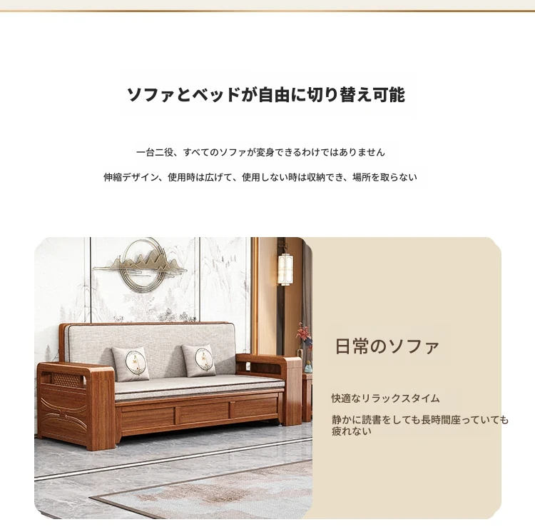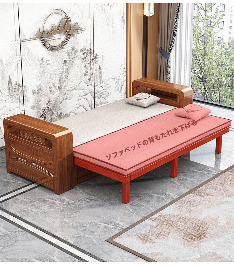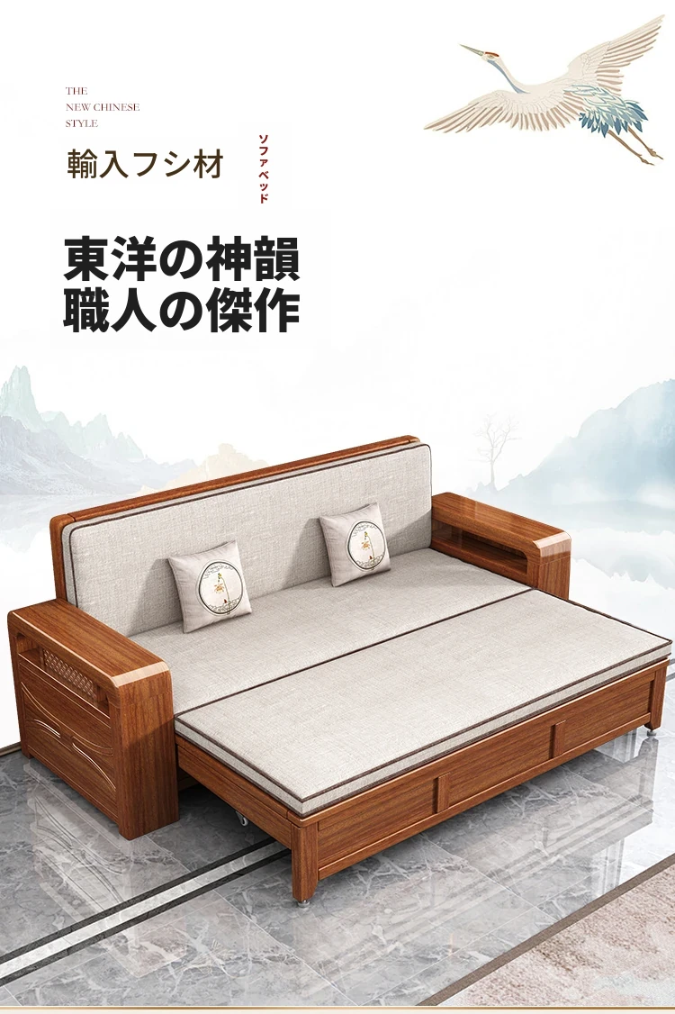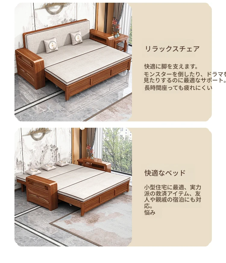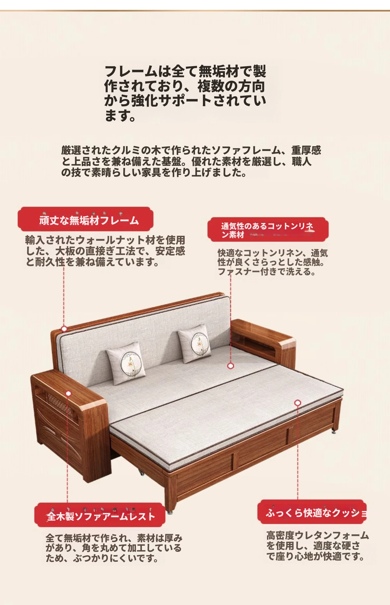 ウォールナット材の無垢材ソファベッド、伸縮可能で折りたたみ式の多機能ソファ。小さな部屋にもぴったりな新中式デザインの三人掛けソファ。快適さとスタイルを兼ね備えた、あなたのリビングに最適な選択!