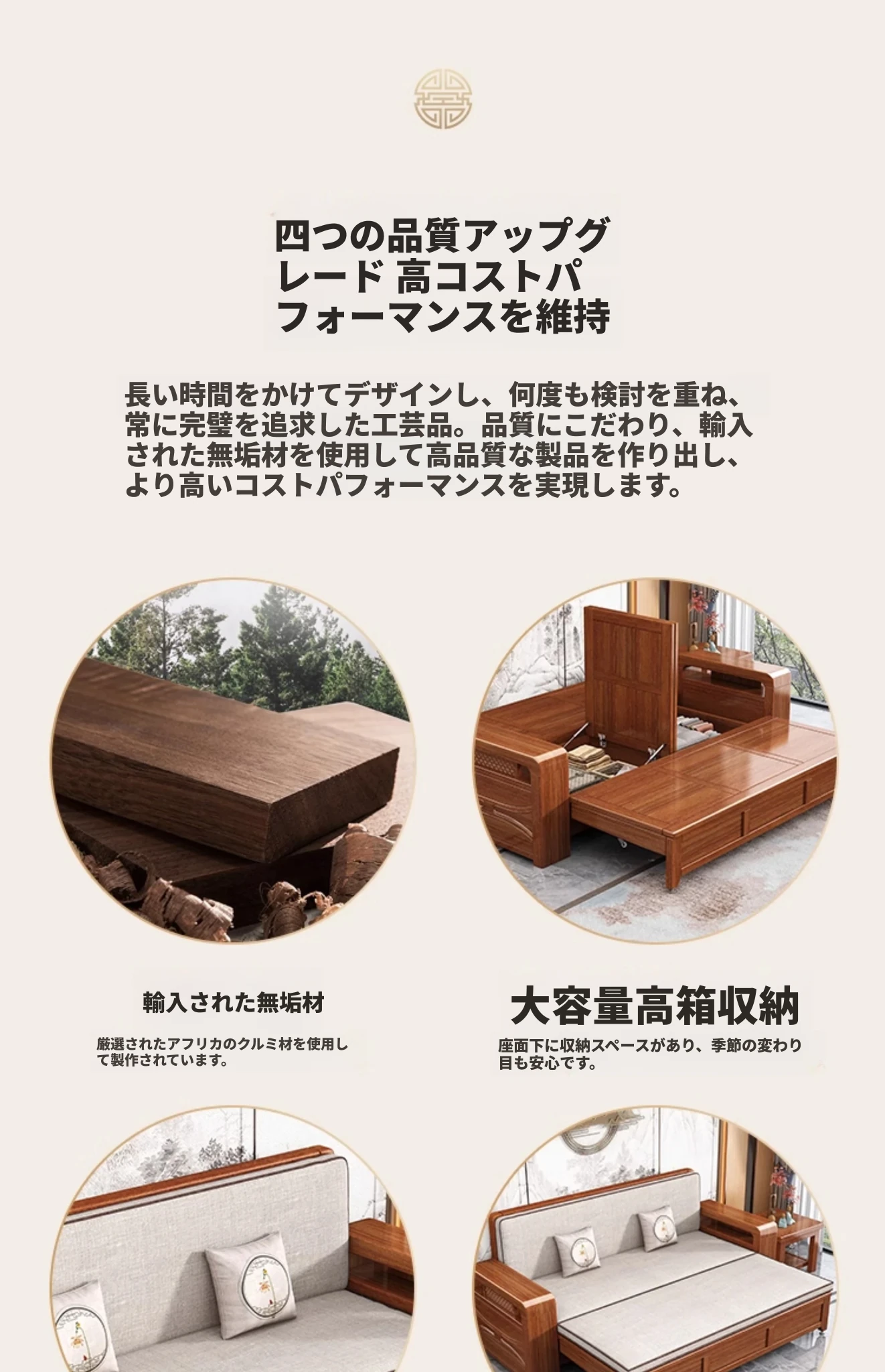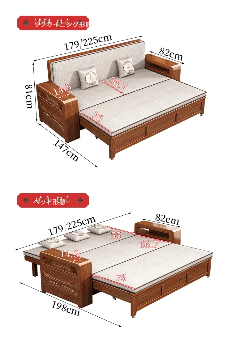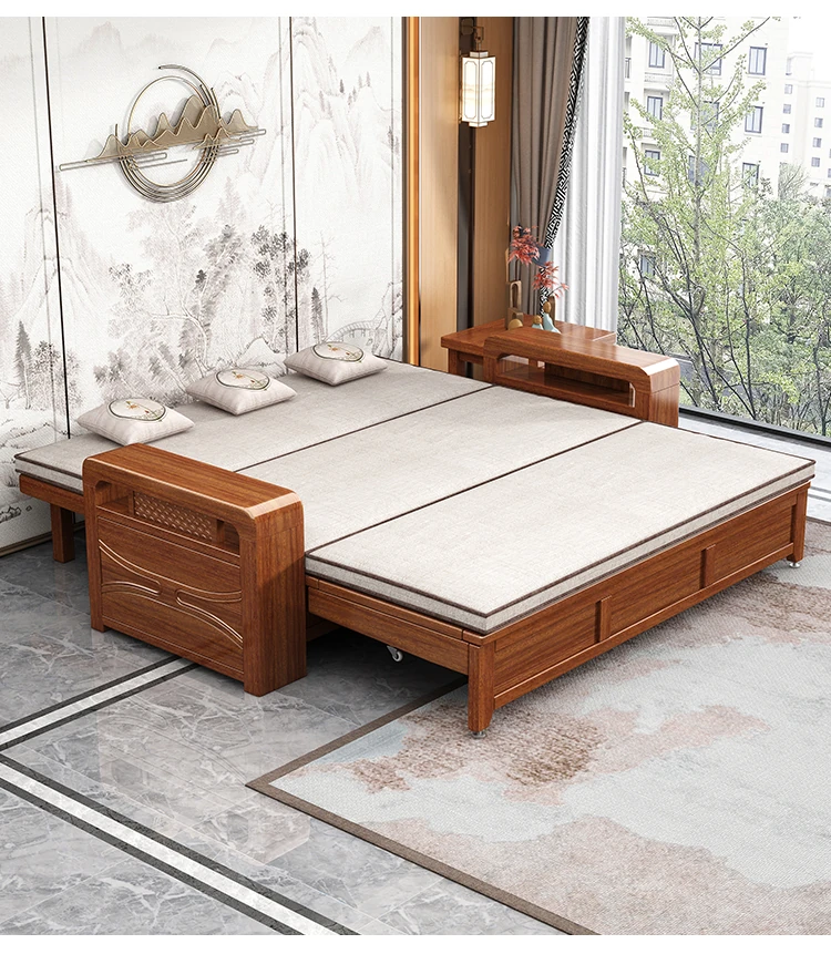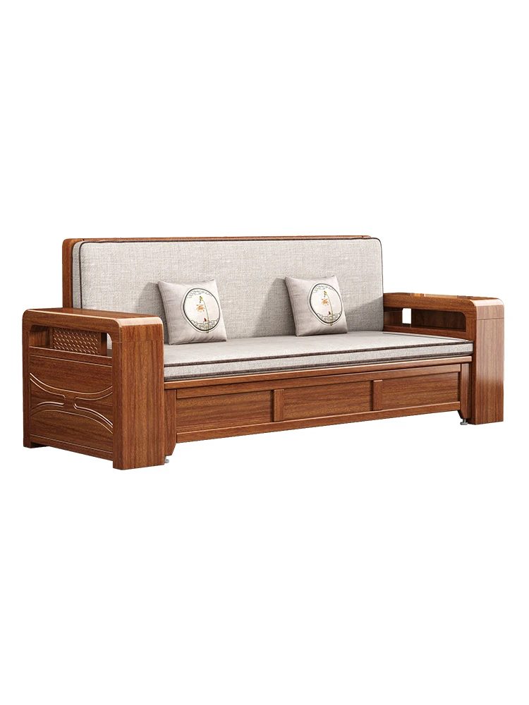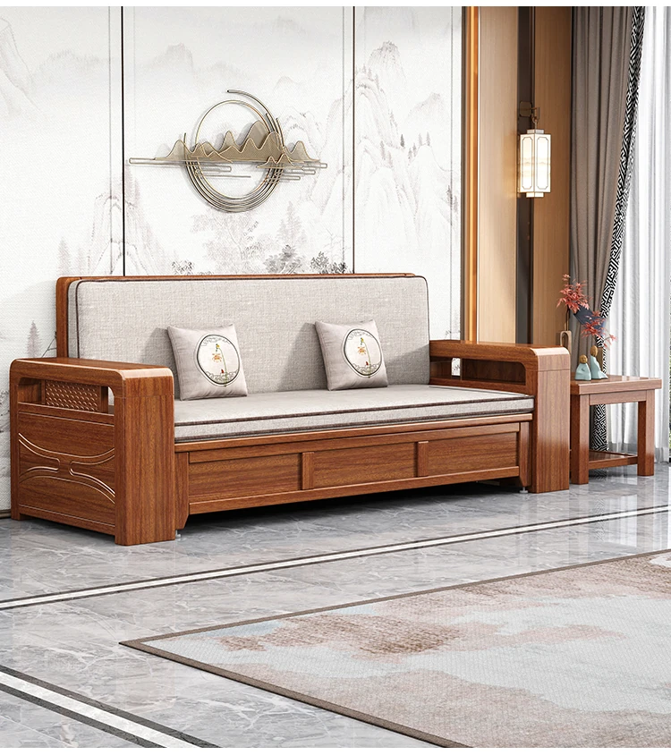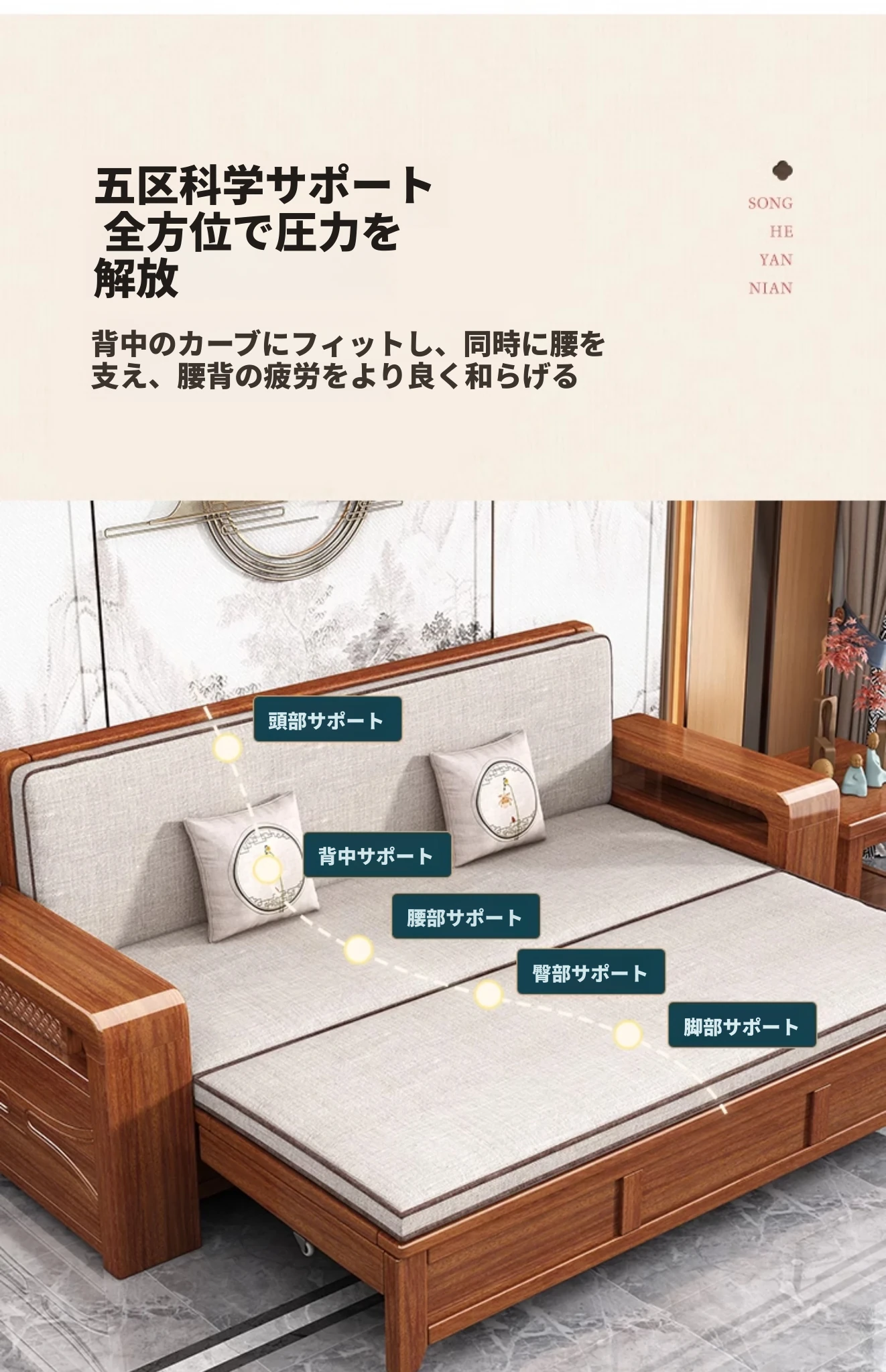 ウォールナット材の無垢材ソファベッド、伸縮可能で折りたたみ式の多機能ソファ。小さな部屋にもぴったりな新中式デザインの三人掛けソファ。快適さとスタイルを兼ね備えた、あなたのリビングに最適な選択!