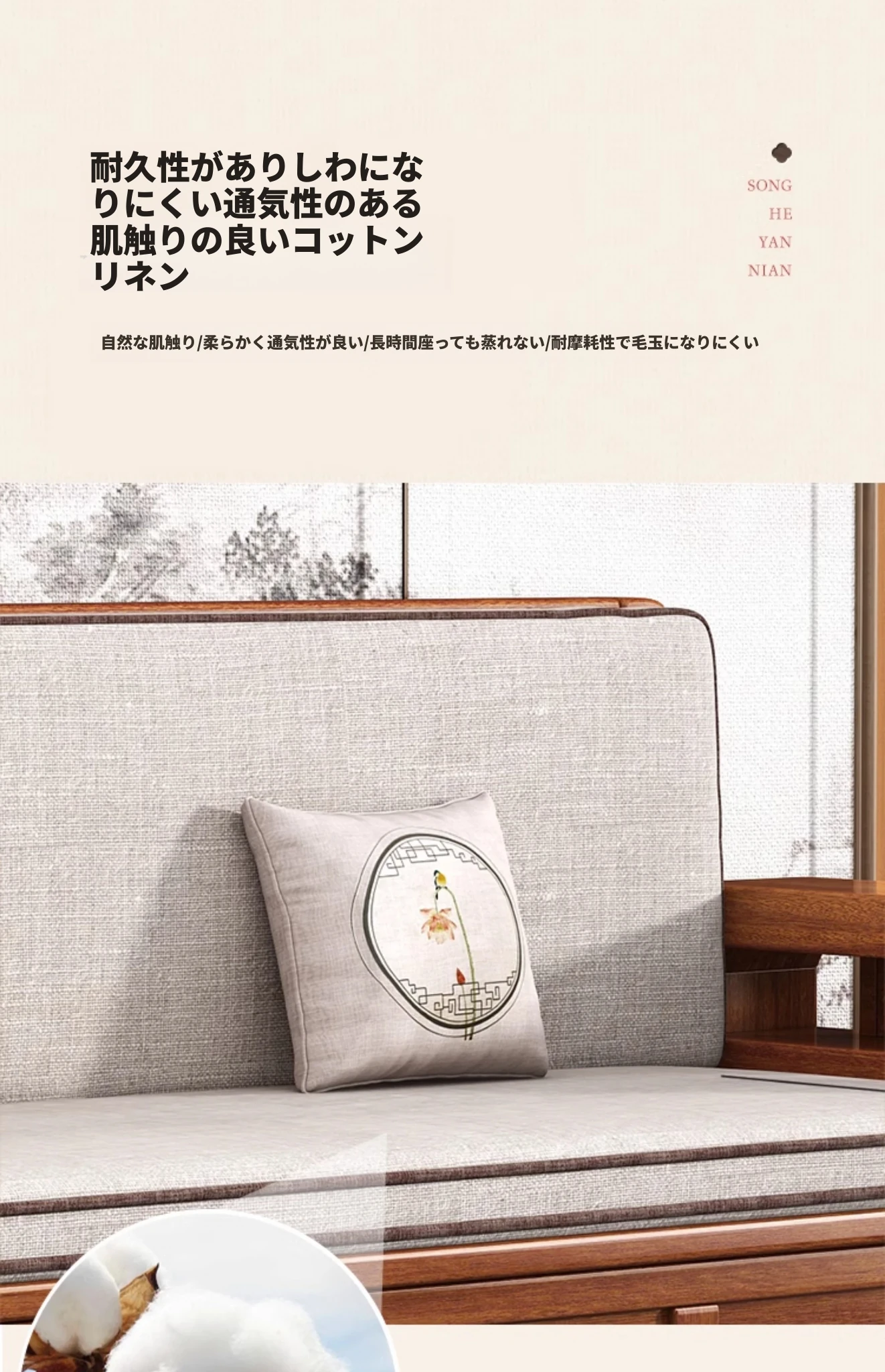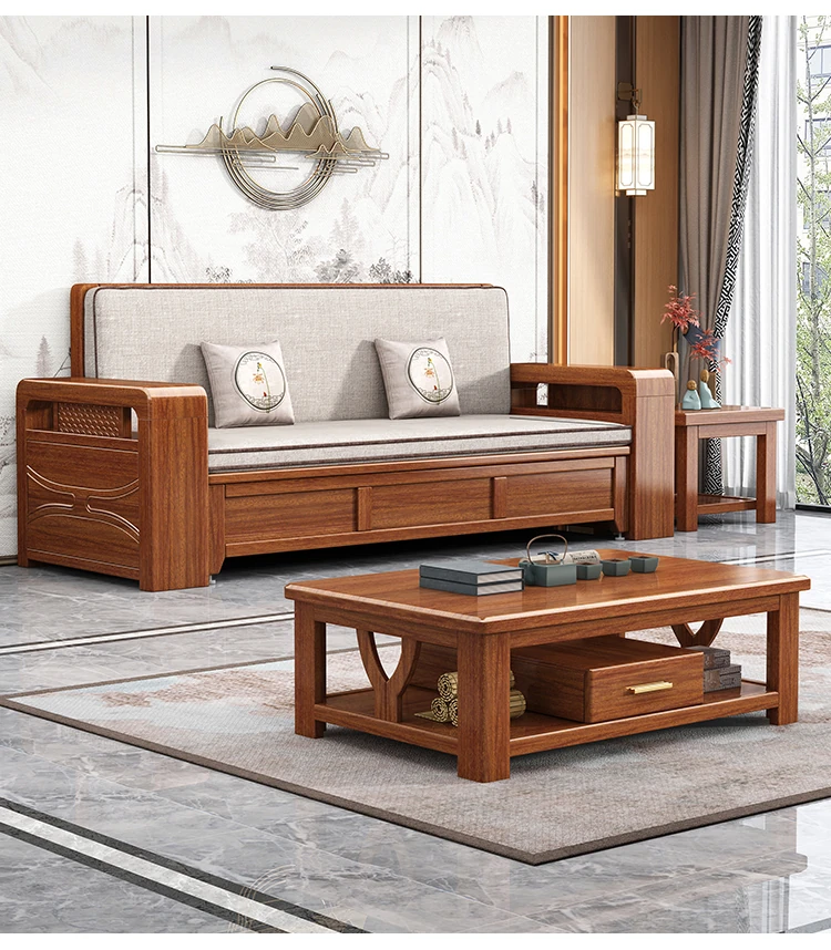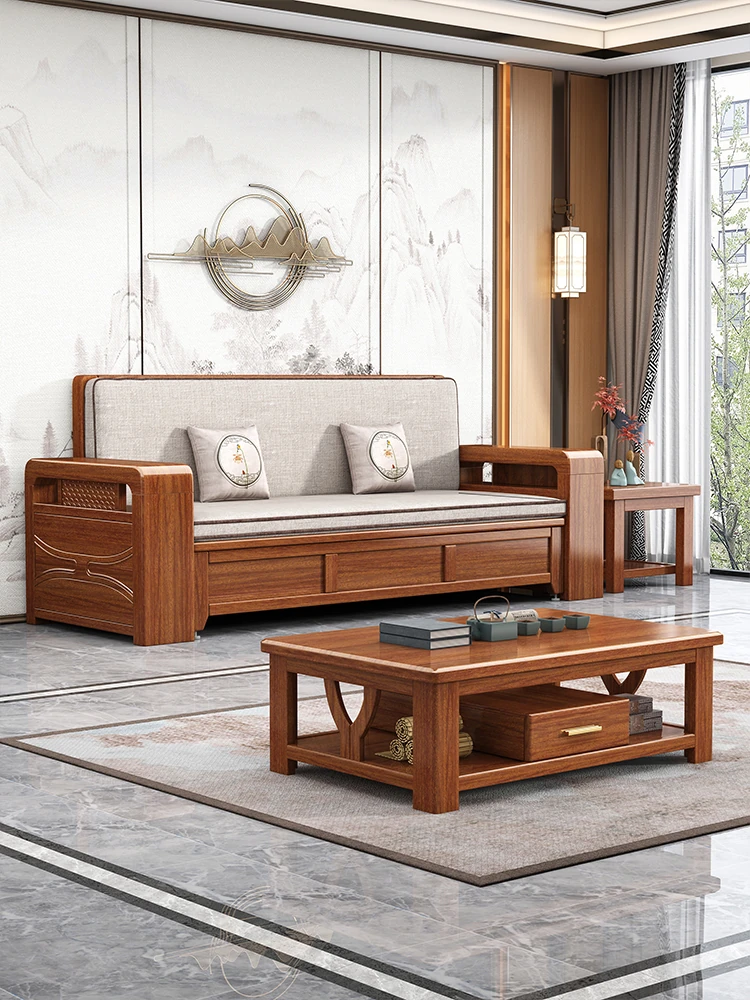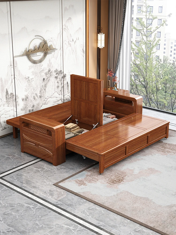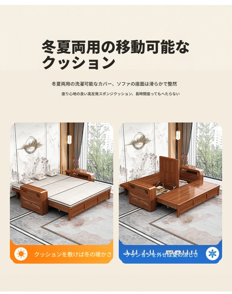 ウォールナット材の無垢材ソファベッド、伸縮可能で折りたたみ式の多機能ソファ。小さな部屋にもぴったりな新中式デザインの三人掛けソファ。快適さとスタイルを兼ね備えた、あなたのリビングに最適な選択!