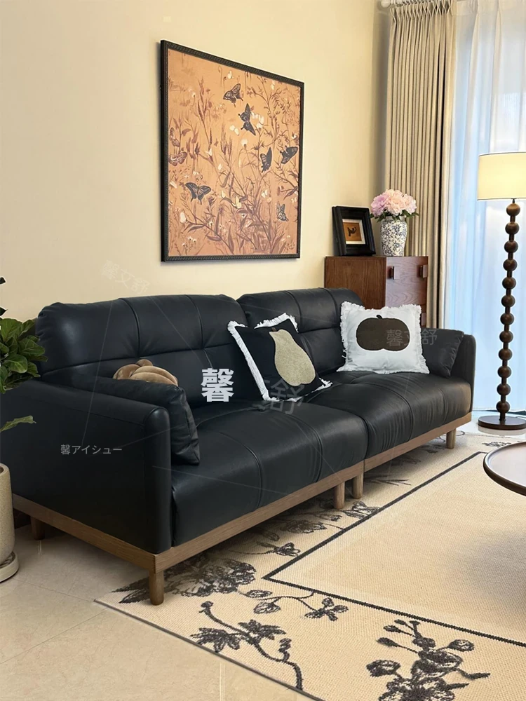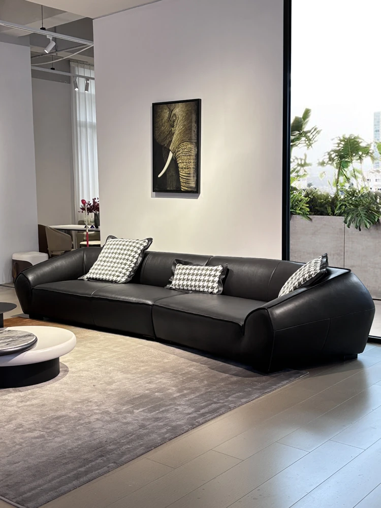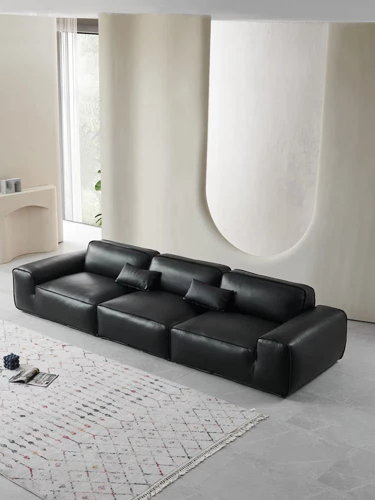 イタリアンミニマリストデザインのブラックレザーソファ - 高品質の本革で作られた、贅沢なダウンクッションの直排ソファ。リビングや別荘に最適なスタイリッシュなブラック。