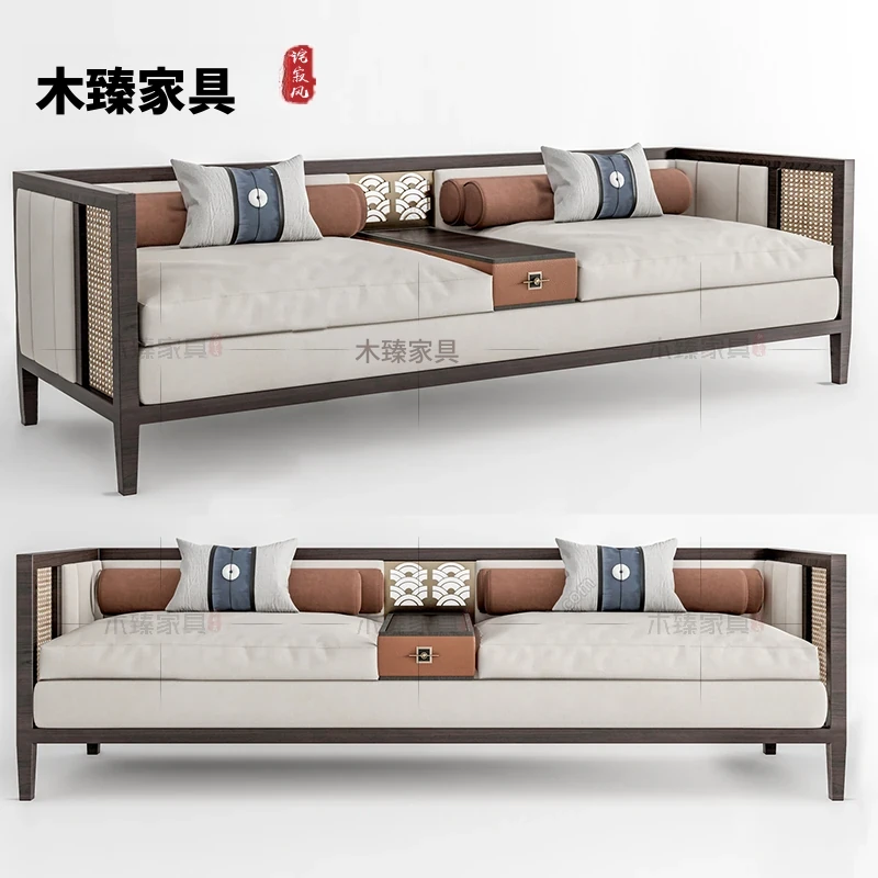 新中式スタイルの無垢材と籐編みのソファ - 北欧モダン茶室・会所の休憩エリアに最適!ホテルロビーや商談スペースにもぴったりなデザインで、上質な寛ぎを提供します。