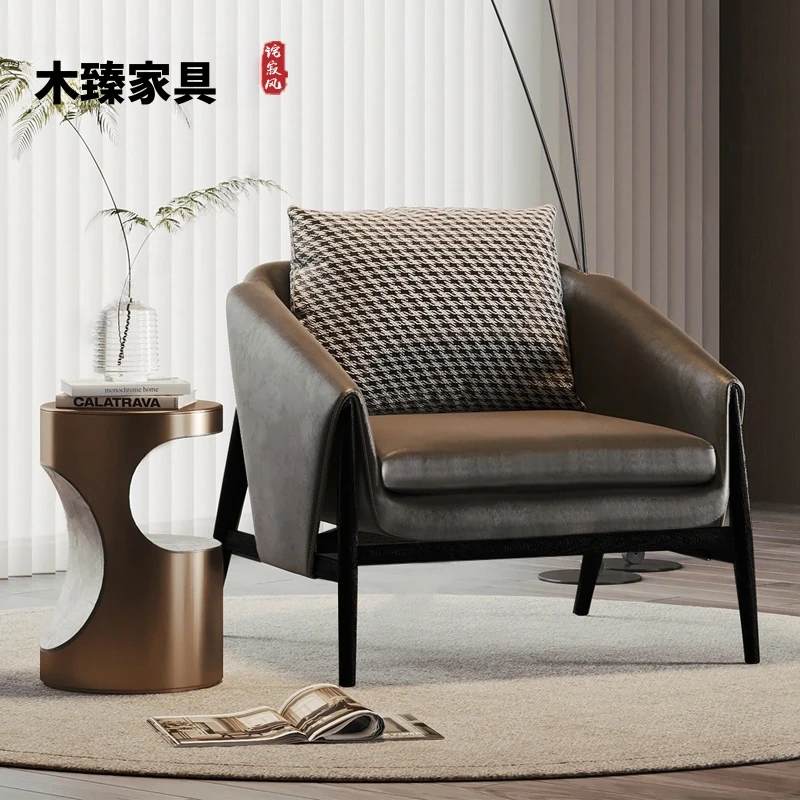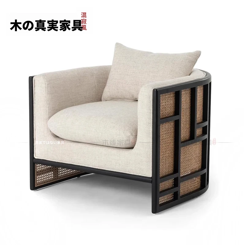 新中式天然木製ソファチェア|北欧風ホテル・クラブ向け|リビングや商談に最適な侘寂スタイル|民宿や寝室にぴったりのリラックスチェア