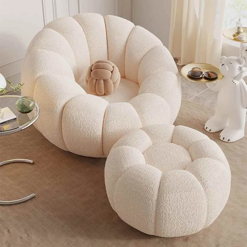 リラックスできる南瓜花びら型のアームチェア!クリーミーな風合いでおしゃれな回転式、一人用ソファ。寝室やバルコニーにぴったりのリラックスチェアで、居心地の良さを実感してください!